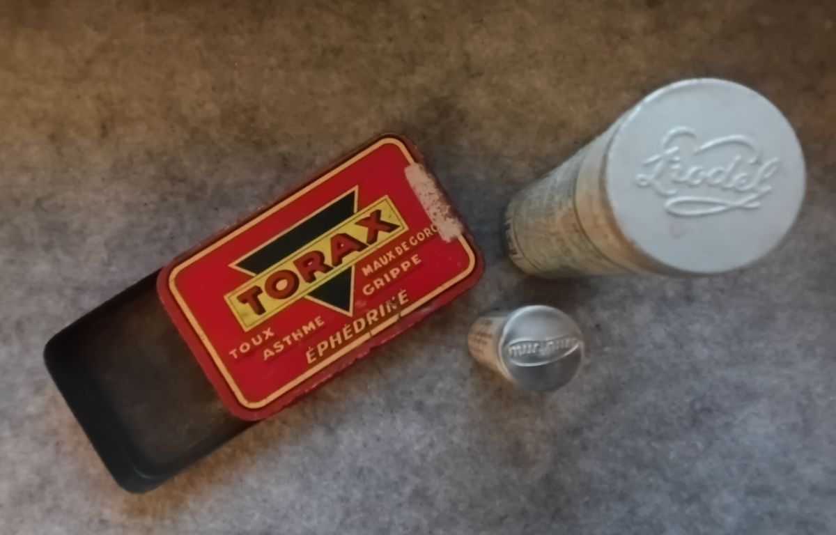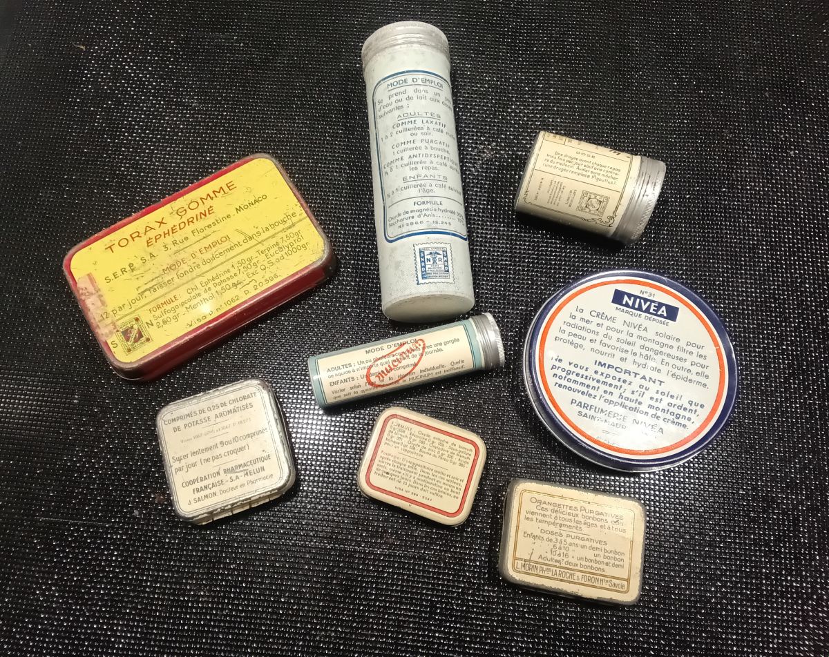 TORAX EPHEDRINE; MAGNESIE S. PELLEGR8NO; FLUXINE Dragées ; NIVEA CREME SOLAIRE; MUCINUM comprimés ; CHLORA-MINT (abîmée mais reste correct); ANUSAL Échantillon médical; ORANGETTES du Docteur MORIN.