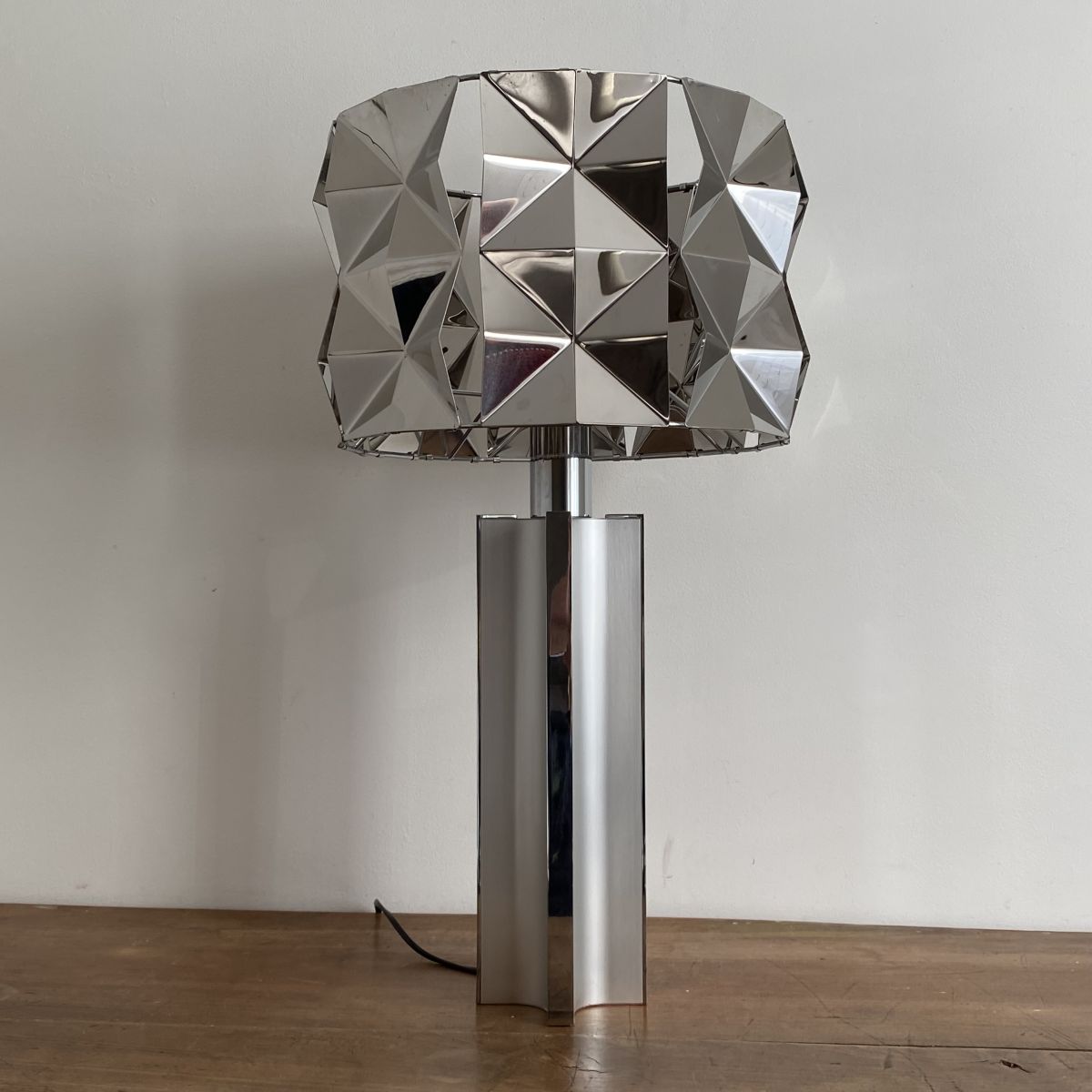 Imposant pied sculptural en croix des années 70. Acier chromé et inox brossé.