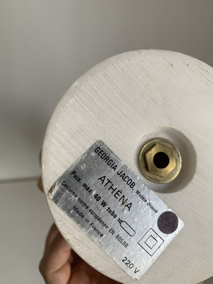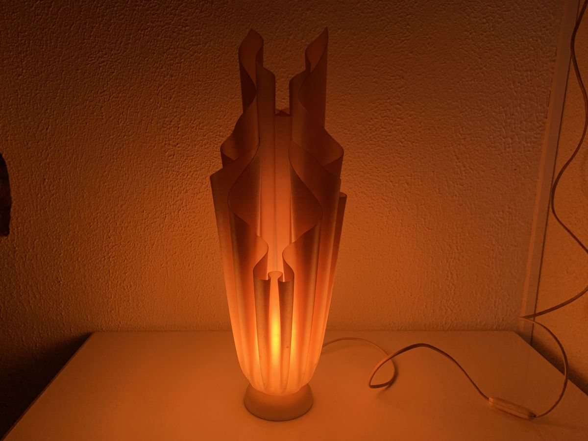 L'interrupteur se trouve sur le cable, elle fonctionne avec ampoule à vis petit culot (e 14 non fournie). Eclairée, elle diffuse une lumière tamisée très douce. Elle signée sous la base.