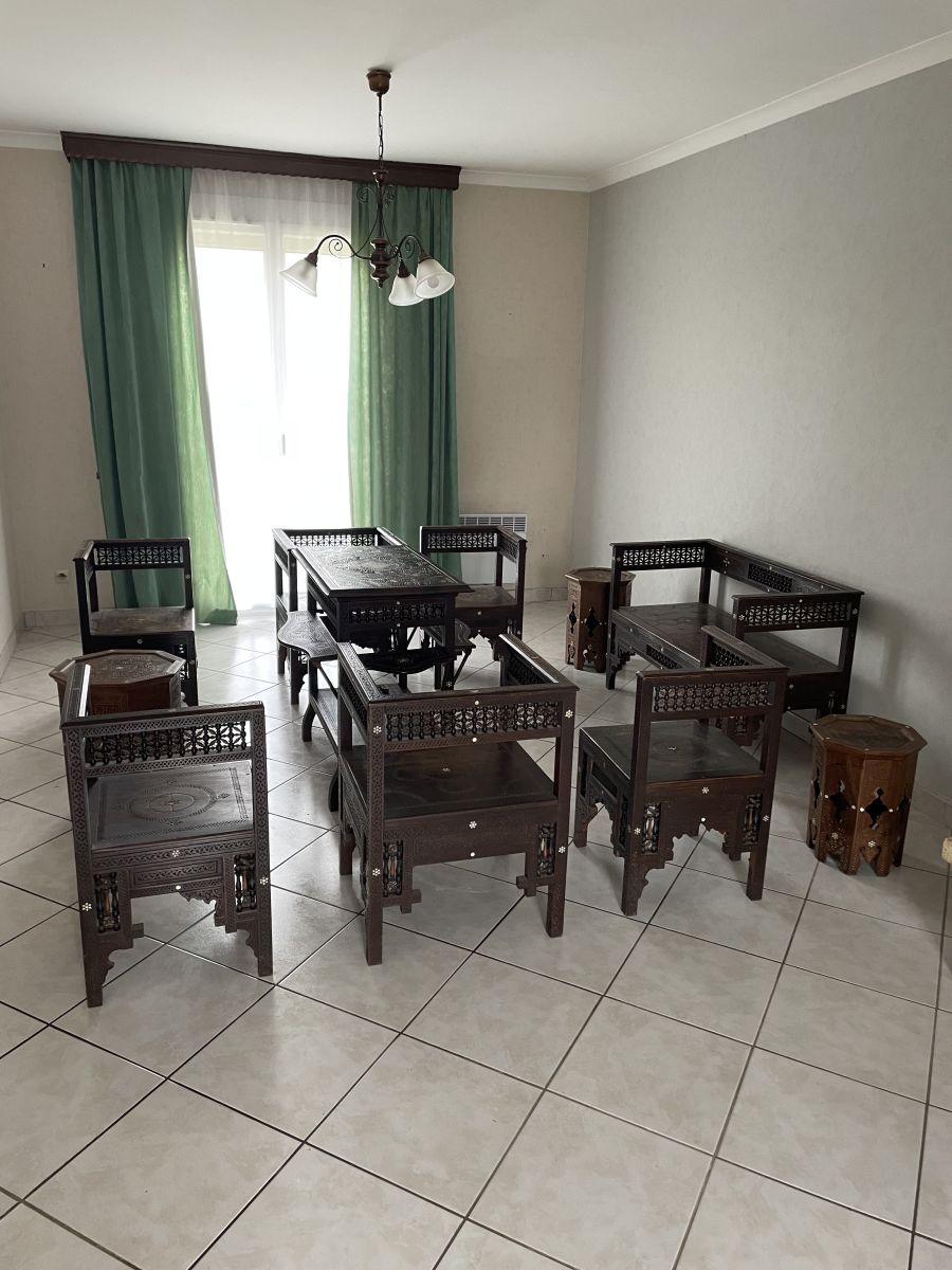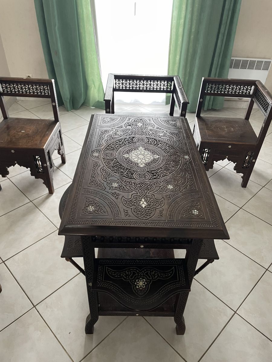 Estimation 1200 euros ➡️ Négociable dans une fourchette 900 à 1 200 € selon rapidité de vente.ensemble complet de salon oriental en bois massif finement sculpté, avec incrustations de nacre (ou os).