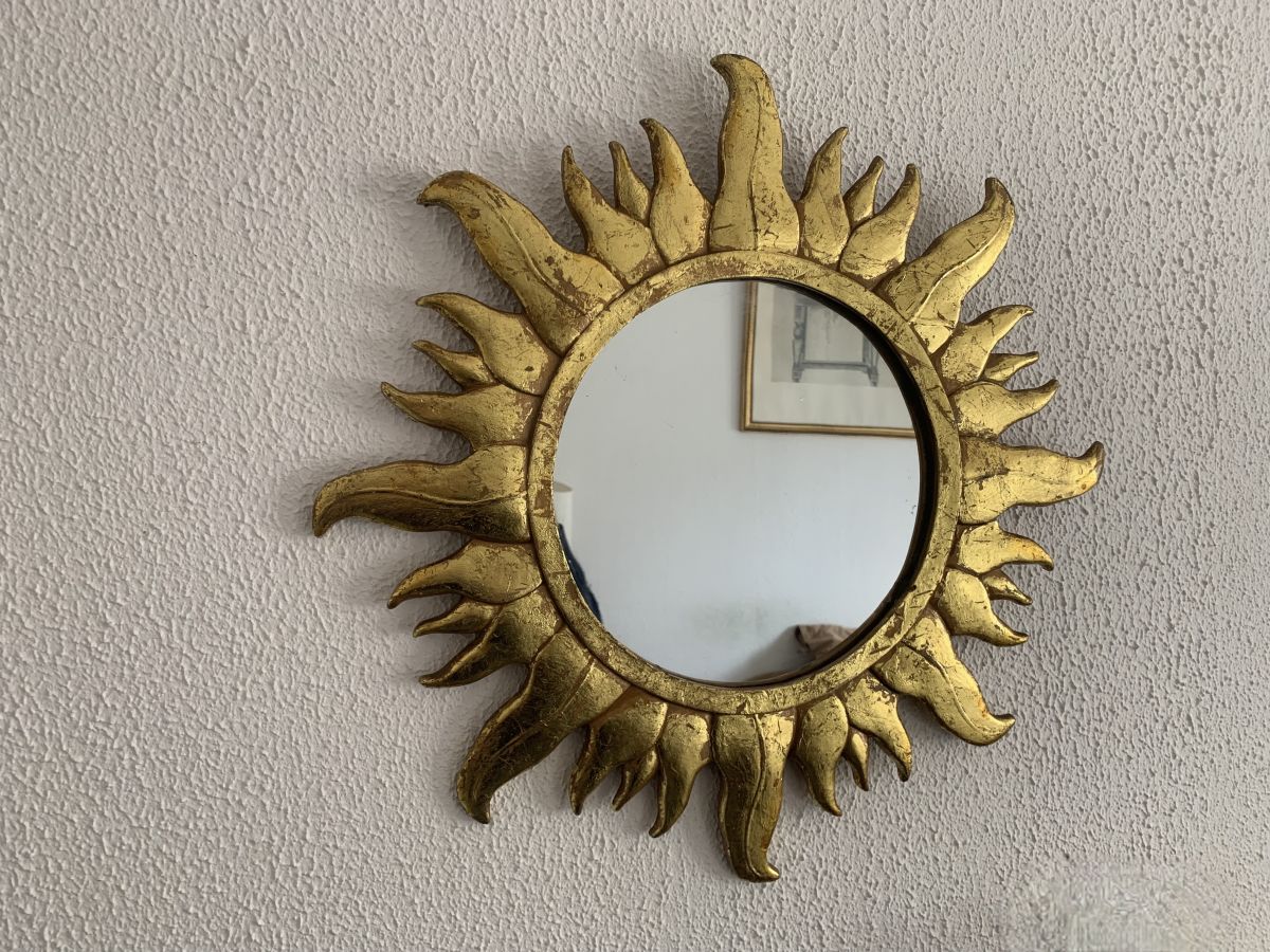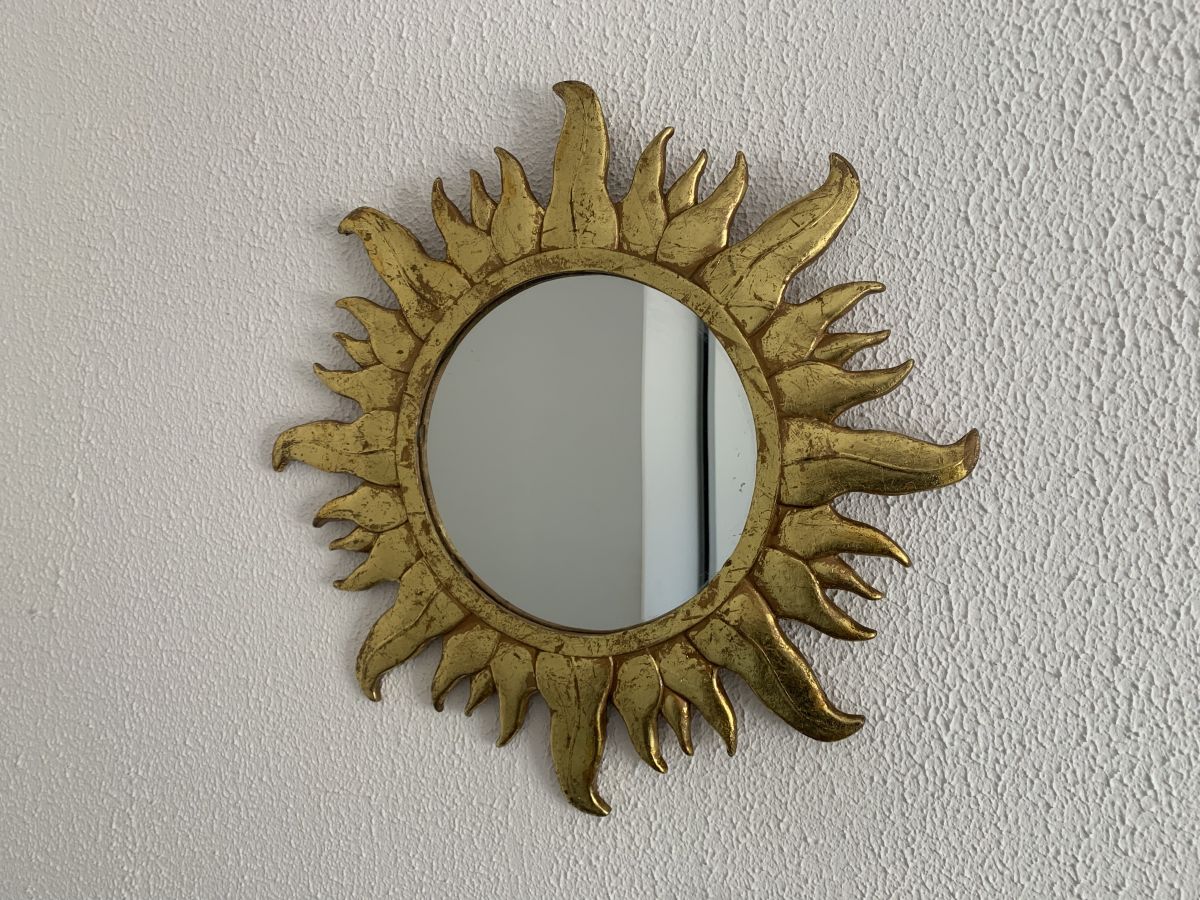 Ancien miroir soleil français dans le style des miroirs oeil de sorcière en résine dorée à l’or fin circa 1960 en bon état