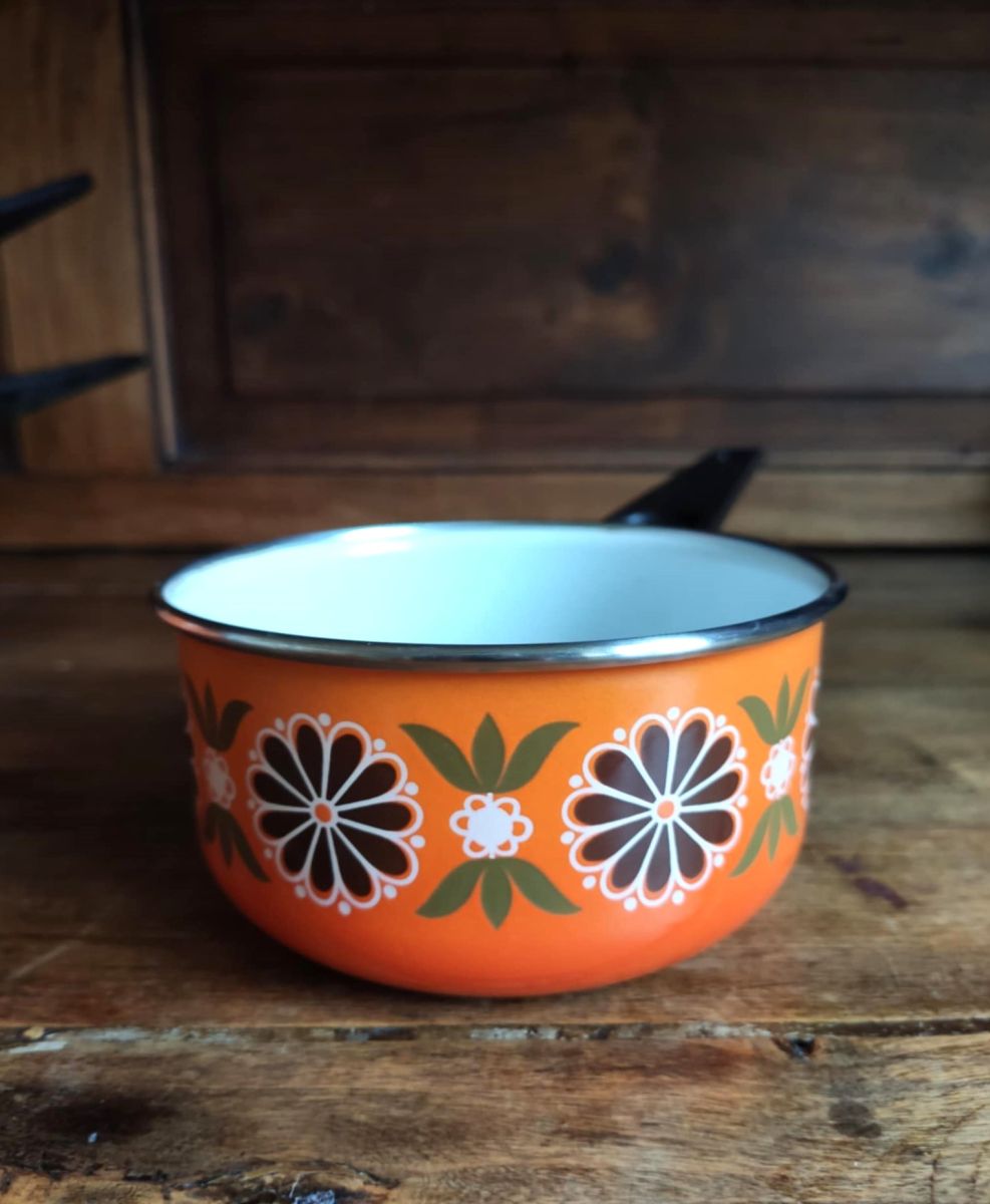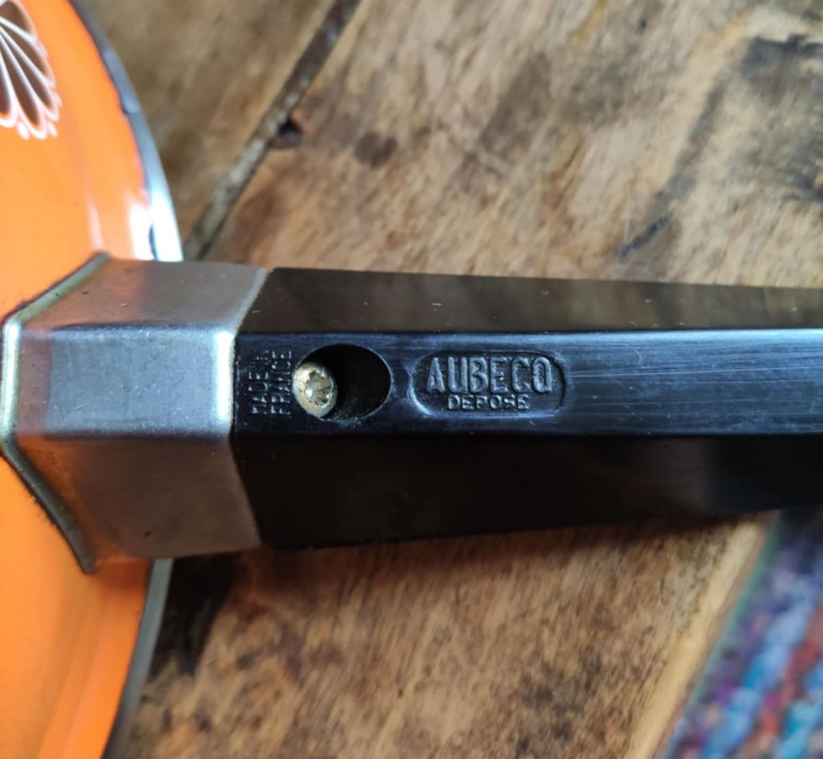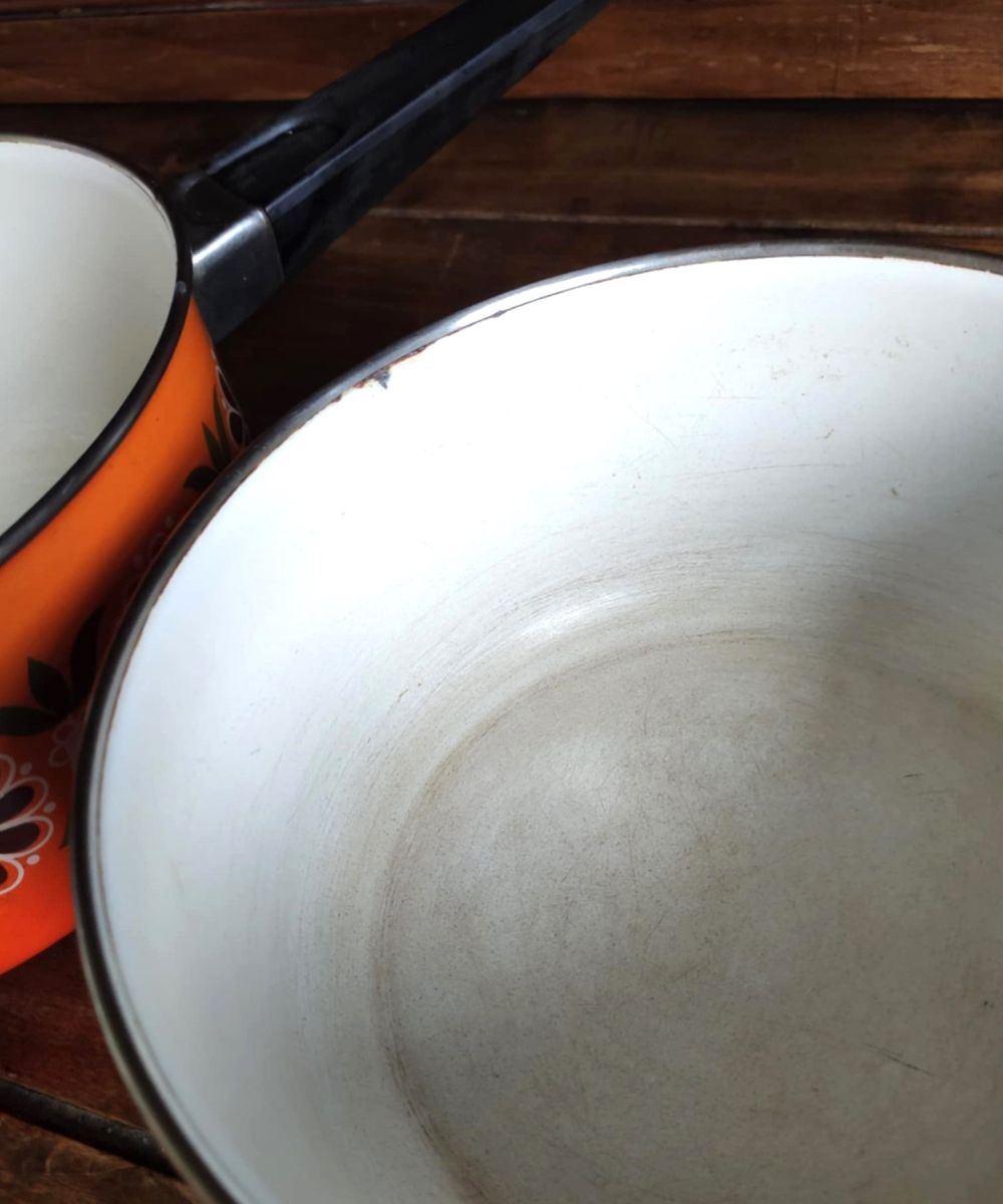 Ensemble de 3 casseroles et une sauteuse avec son couvercle en tôle émaillée de la marque française AUBECQ