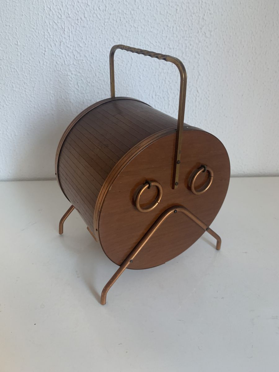 Un objet atypique en bois et métal en forme de fut ou de tonneau à vin. Il s’ouvre en coulissant via son couvercle à lamelles de bois et il y a un autre couvercle dessous. la anse est en laiton.