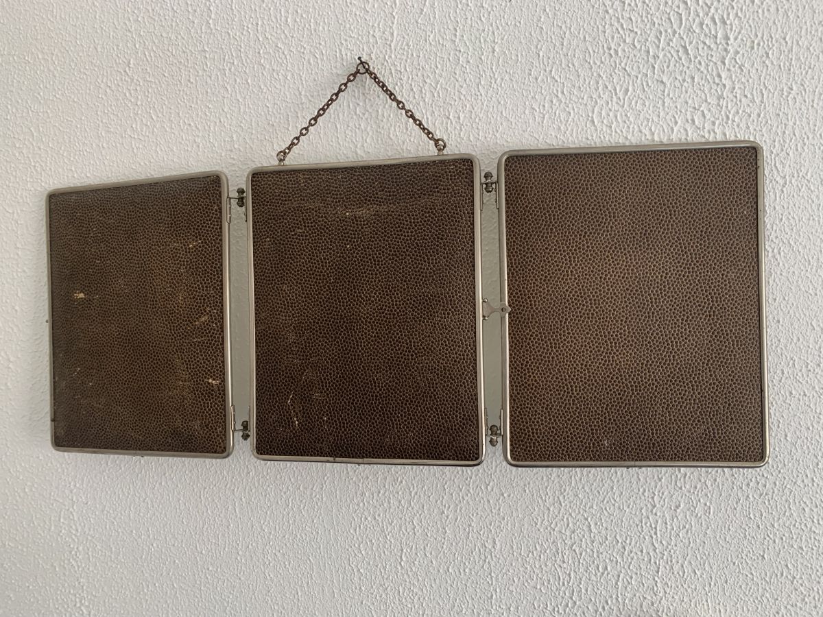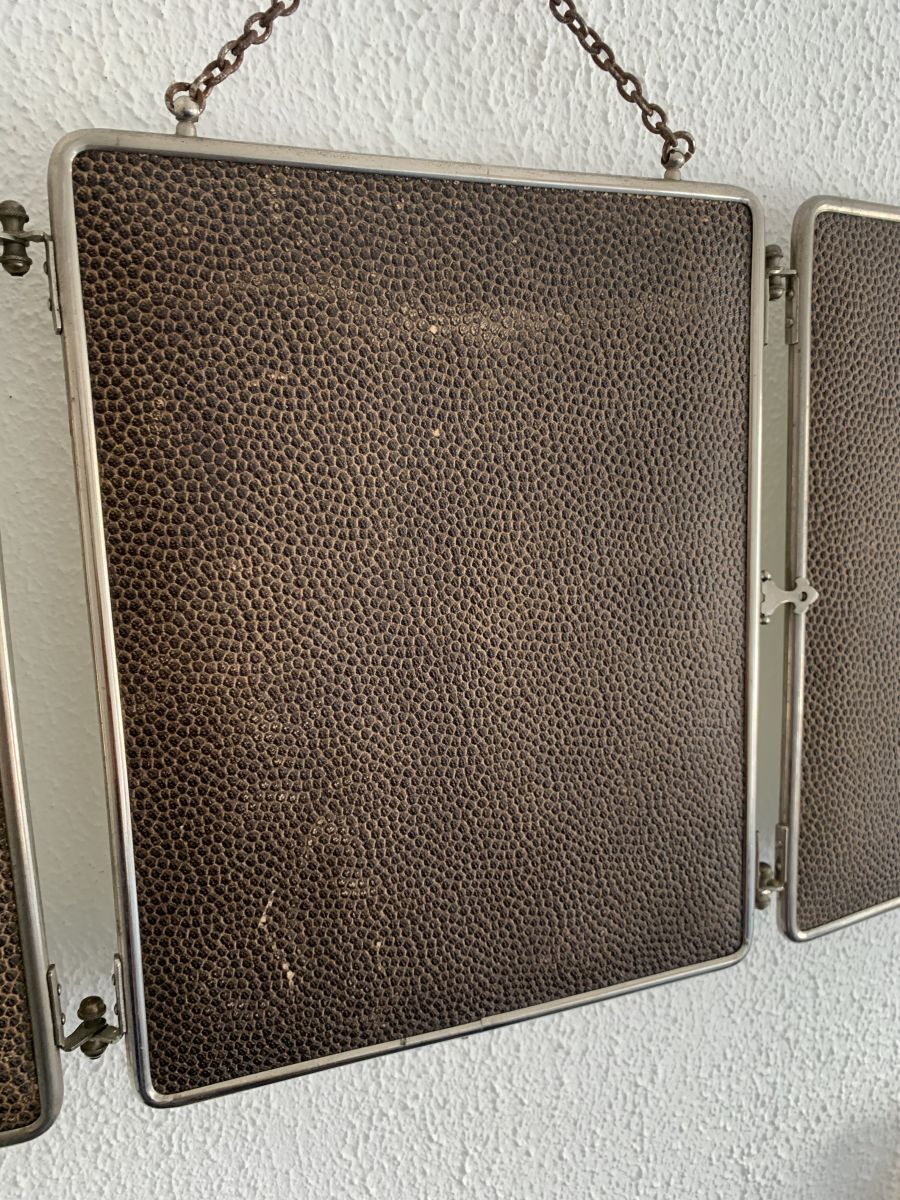 Ancien miroir triptyque de barbier en métal nickelé et simili galuchat circa 1930 en bon état.