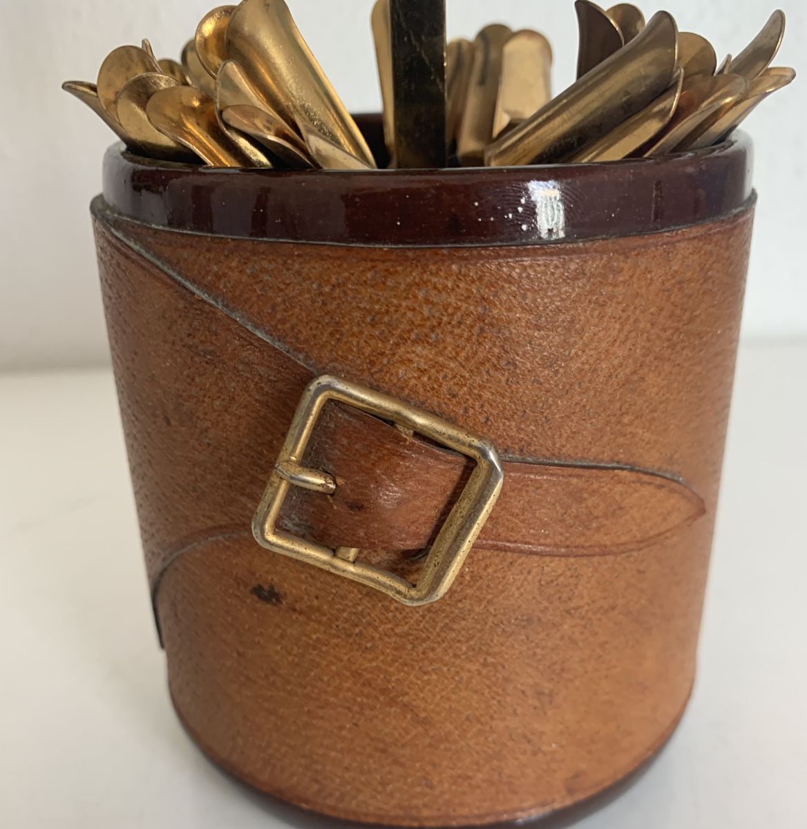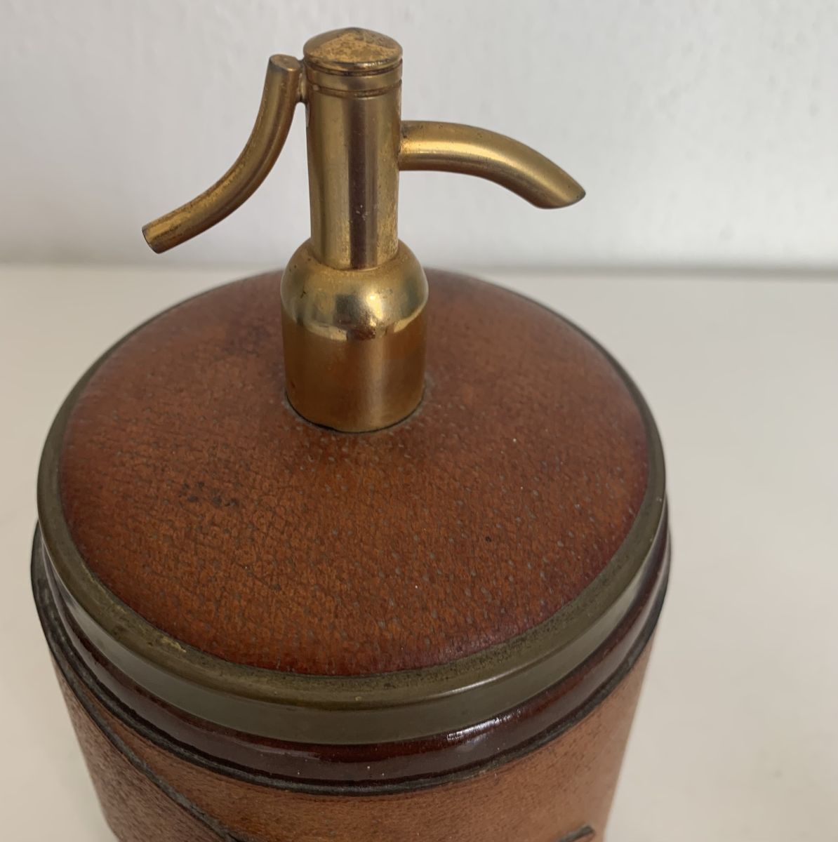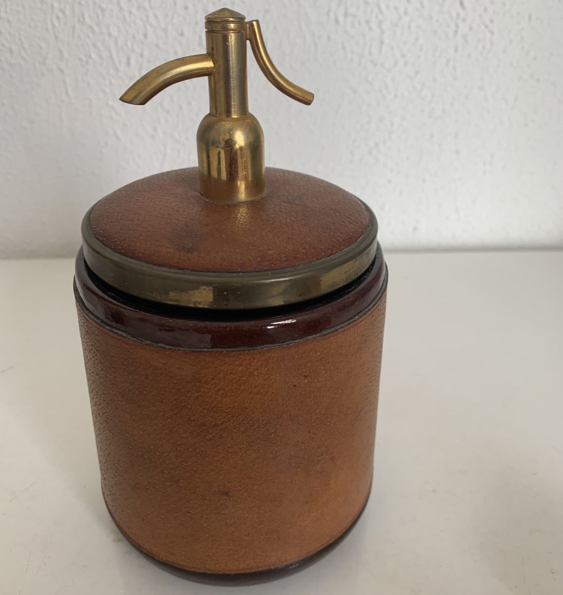 Ancien porte-cigarettes, distributeur à cigarettes en forme de siphon à eau de Seltz, soda en céramique chocolat, cuir et laiton circa 1960 en bon état. il affiche quelques marques et décolorations sans grande méchanceté.