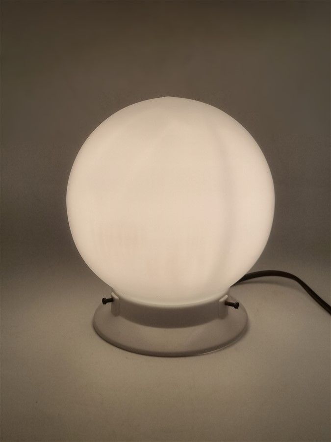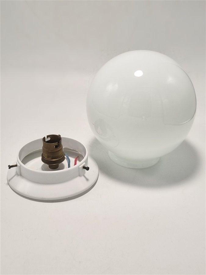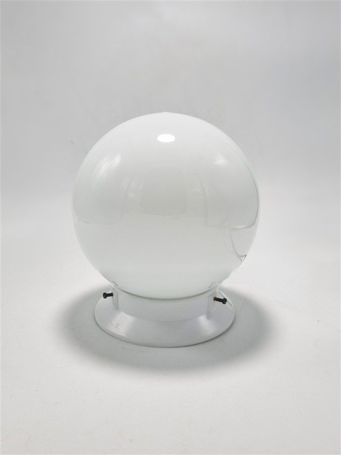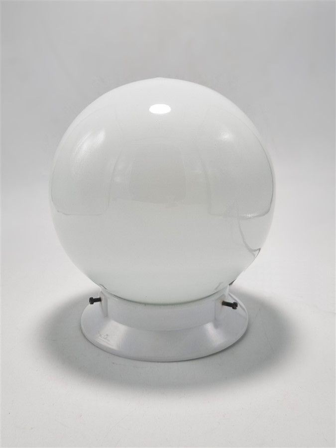 Petit plafonnier composé d’un globe rond en opaline blanche sur une base en matière plastique.