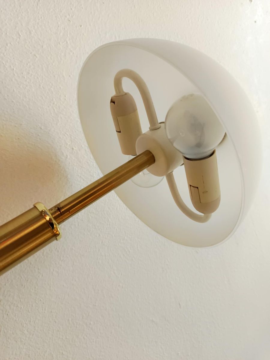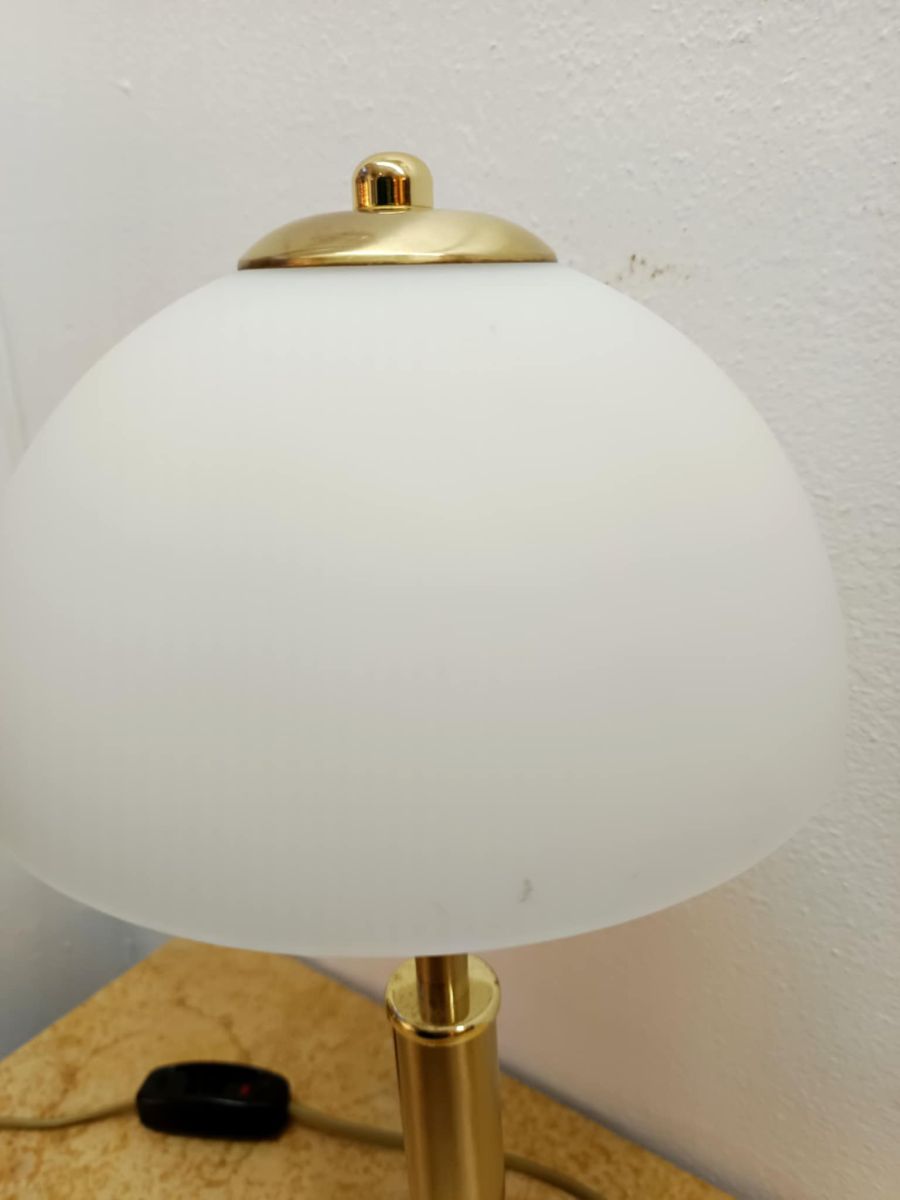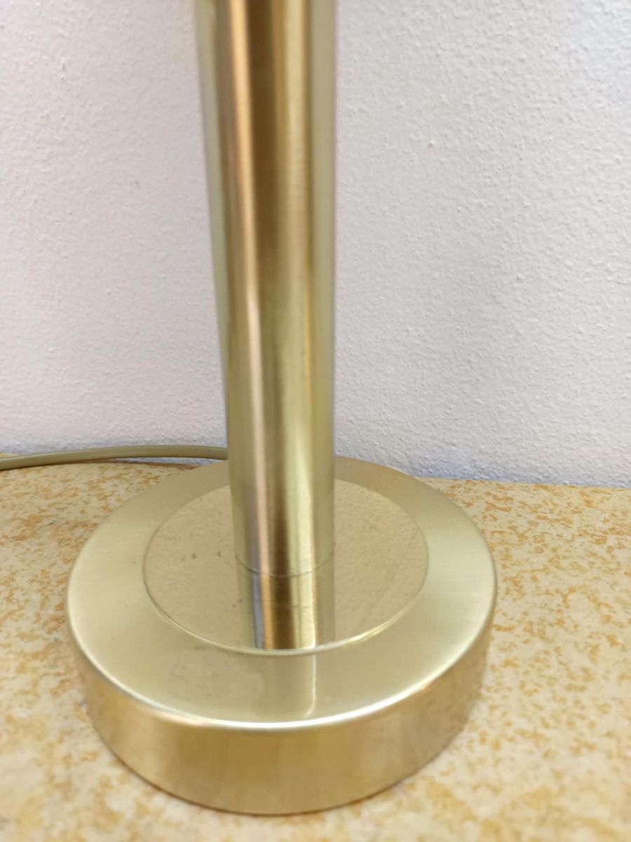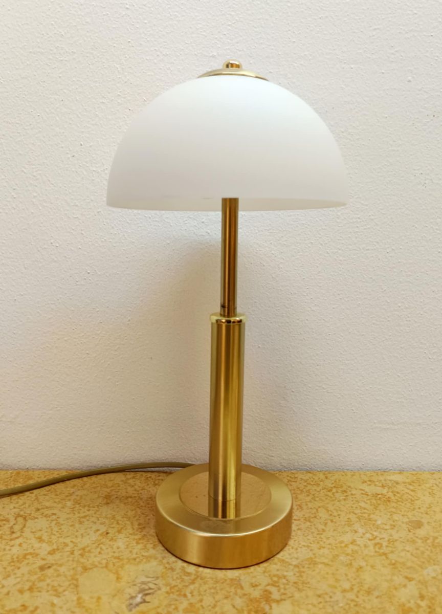 Petit pied de lampe en métal doré avec abat jour en verre blanc mat, fixé par le haut avec un bouton également doré. Deux douilles à culot E14, électrification propre et fonctionnelle.