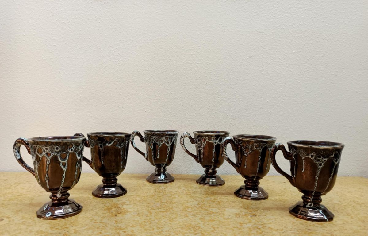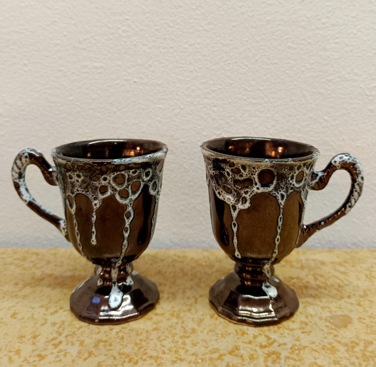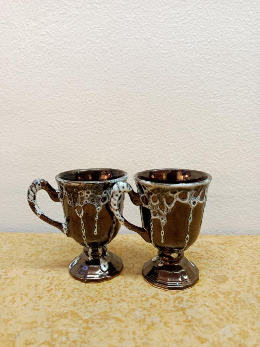 Mazagrans en céramique émaillée, "fat lava" ou écume de mer blanc sur un fond anthracite irisé. Sur pieds, avec anse latérale.