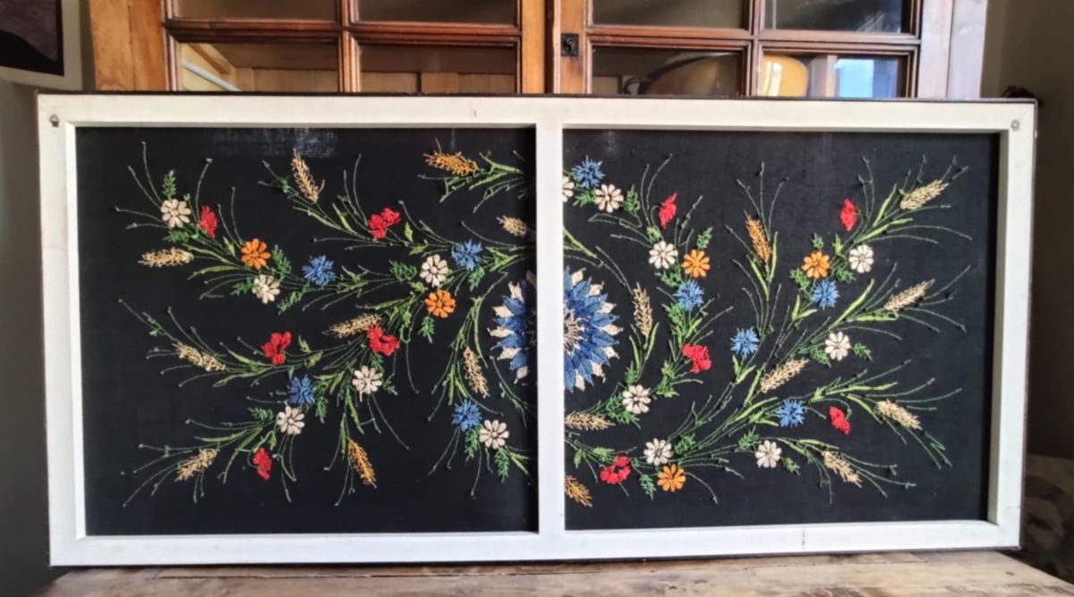 Jolie tenture murale brodée à la main dans son encadrement bois