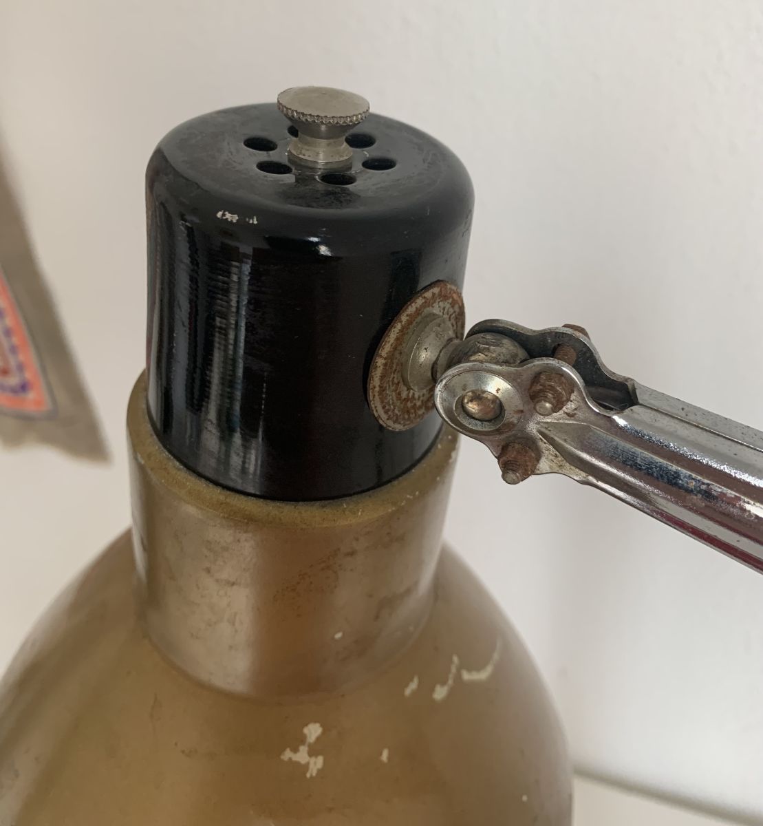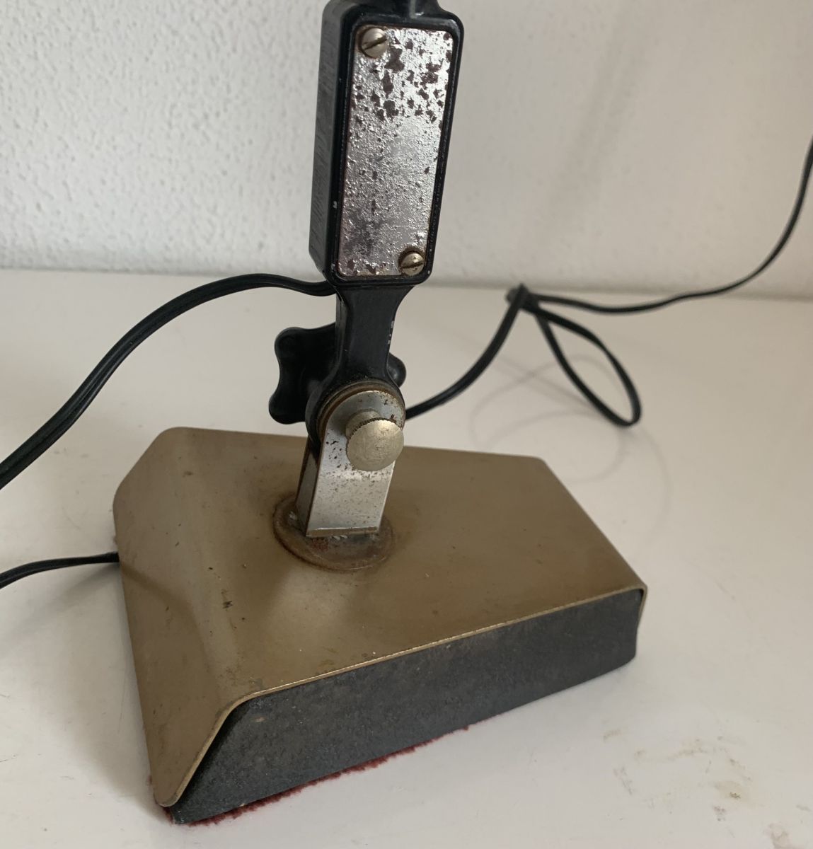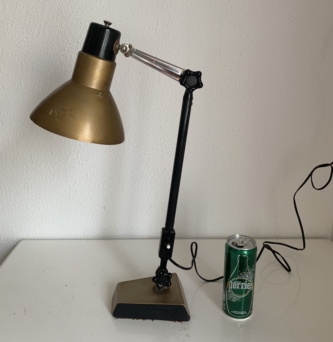 Ancienne lampe d'usine de la marque super Chrome en métal laqué champagne et noir, chromé et Bakélite circa 1950 en bon état.