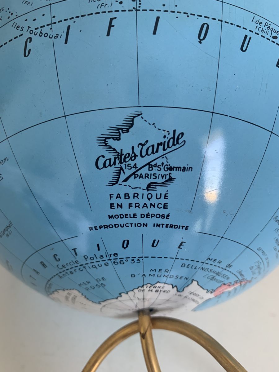 Ancienne mappemonde de la marque Taride en métal laqué circa 1960 en bon état.