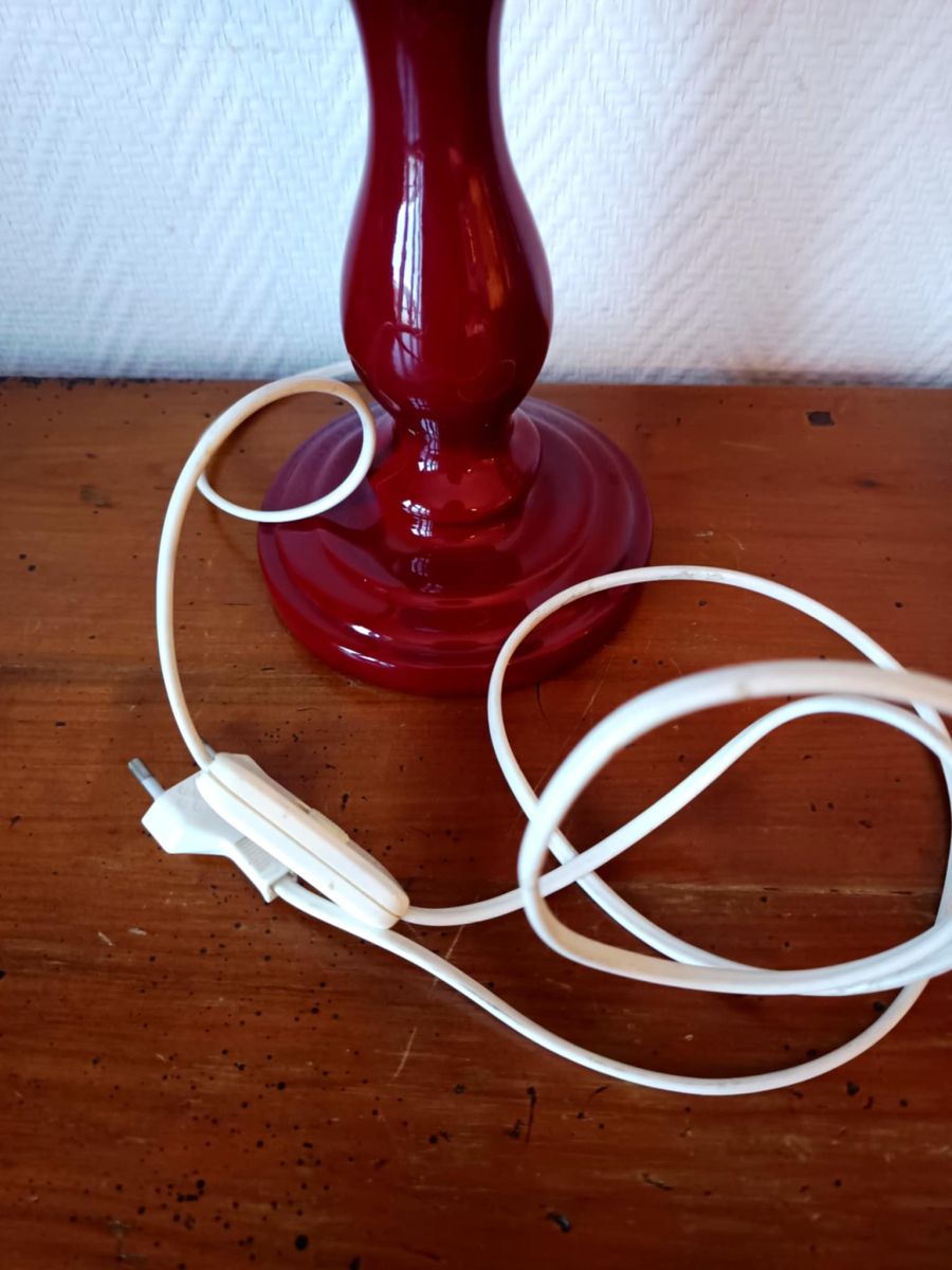 Pied de lampe en céramique bordeaux, avec abat-jour en nacre bleu et laiton.