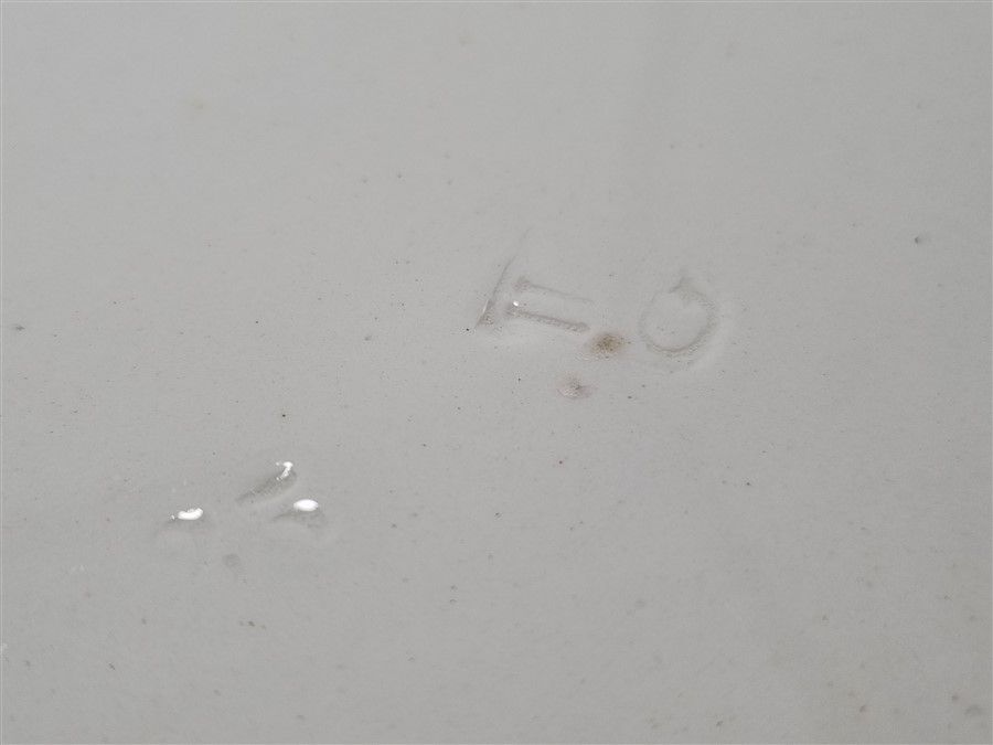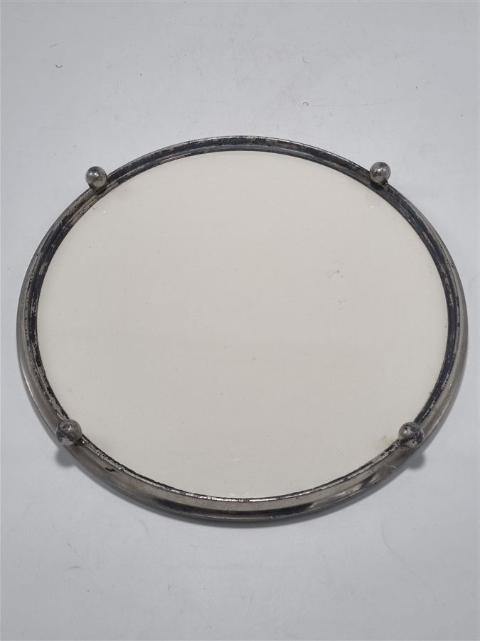 Il est rond, en faïence au décor de fleurs, cerclé de métal. Le cerclage a subi un choc et est légèrement tordu, voir photo.