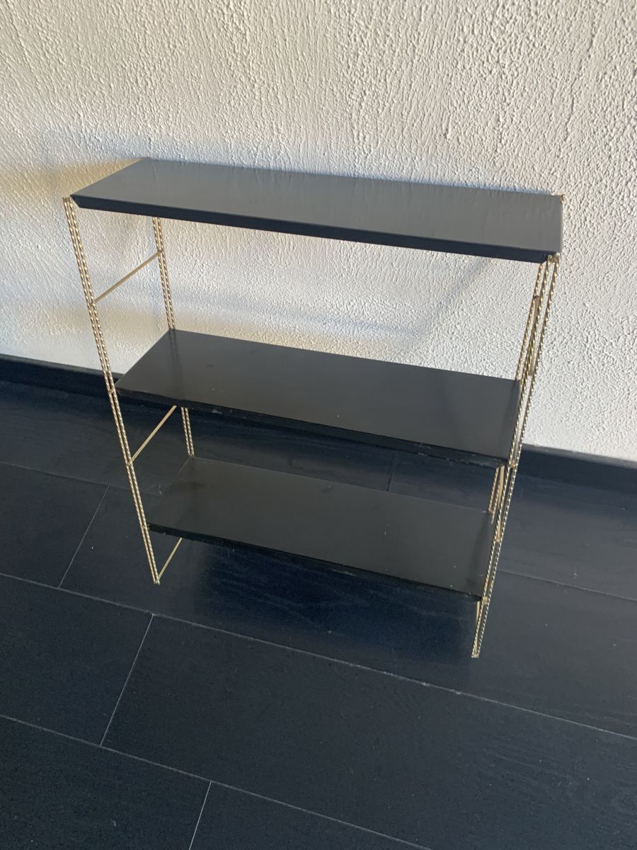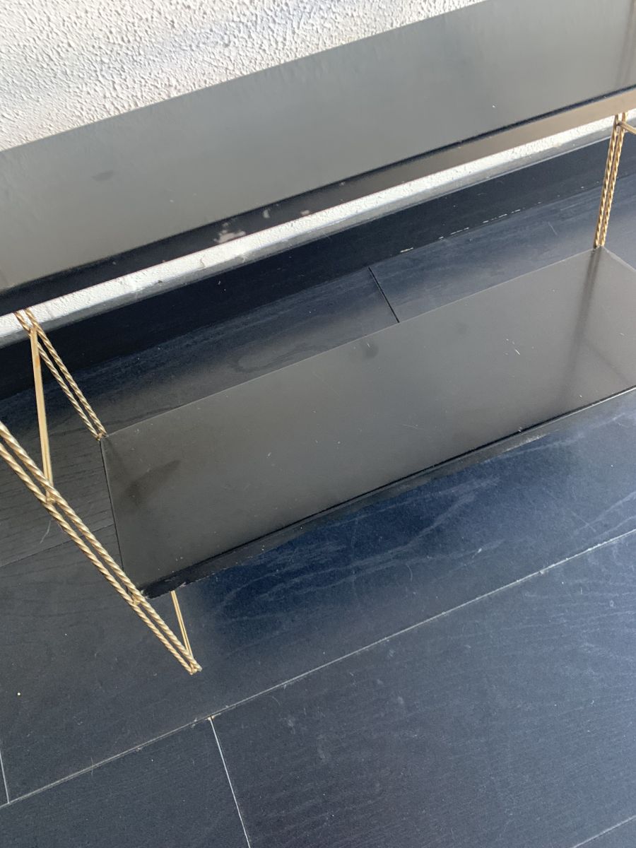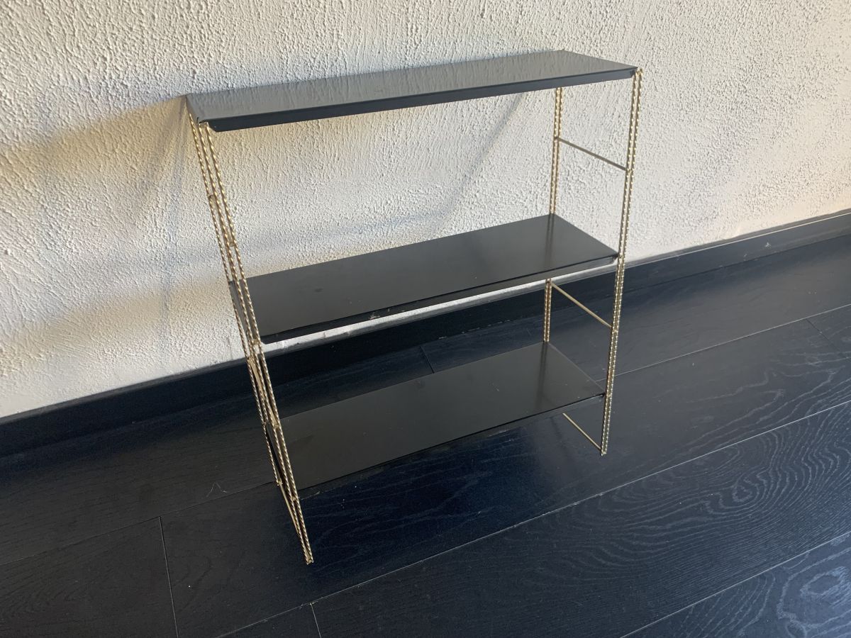 Ancienne étagère string murale (à fixer sur un mur) en métal doré et planches en tôle laquées noire circa 1960 en bon état.