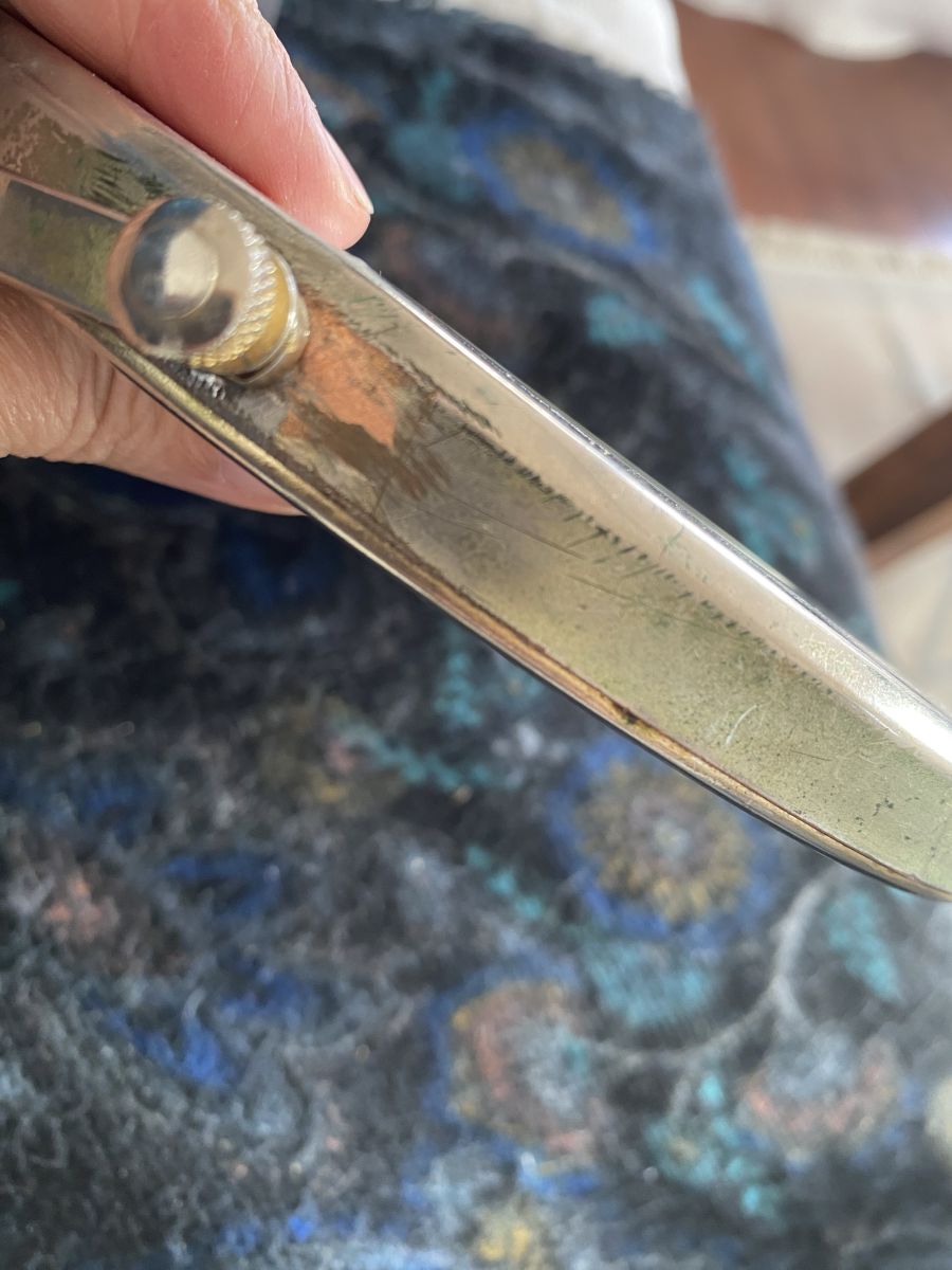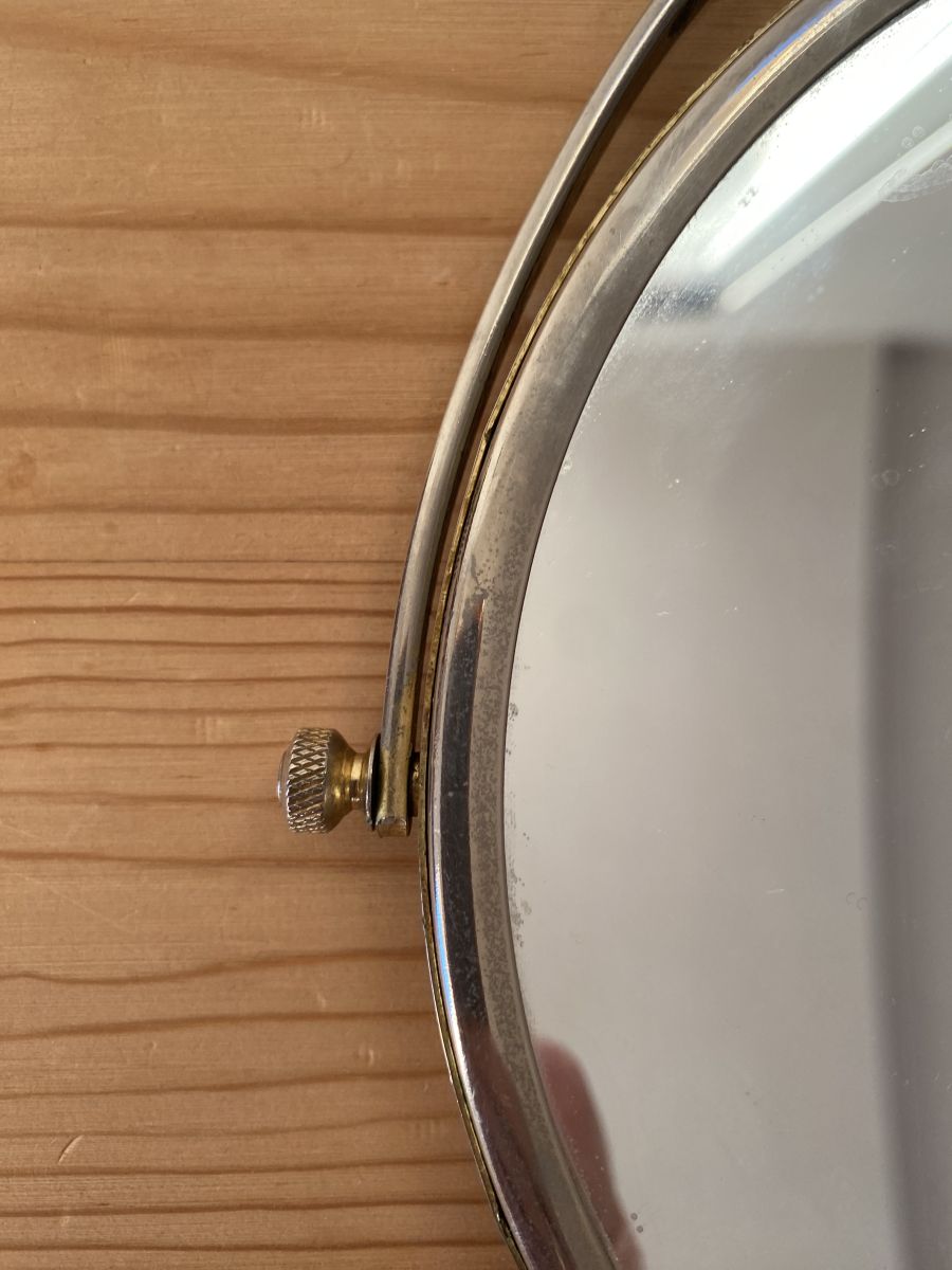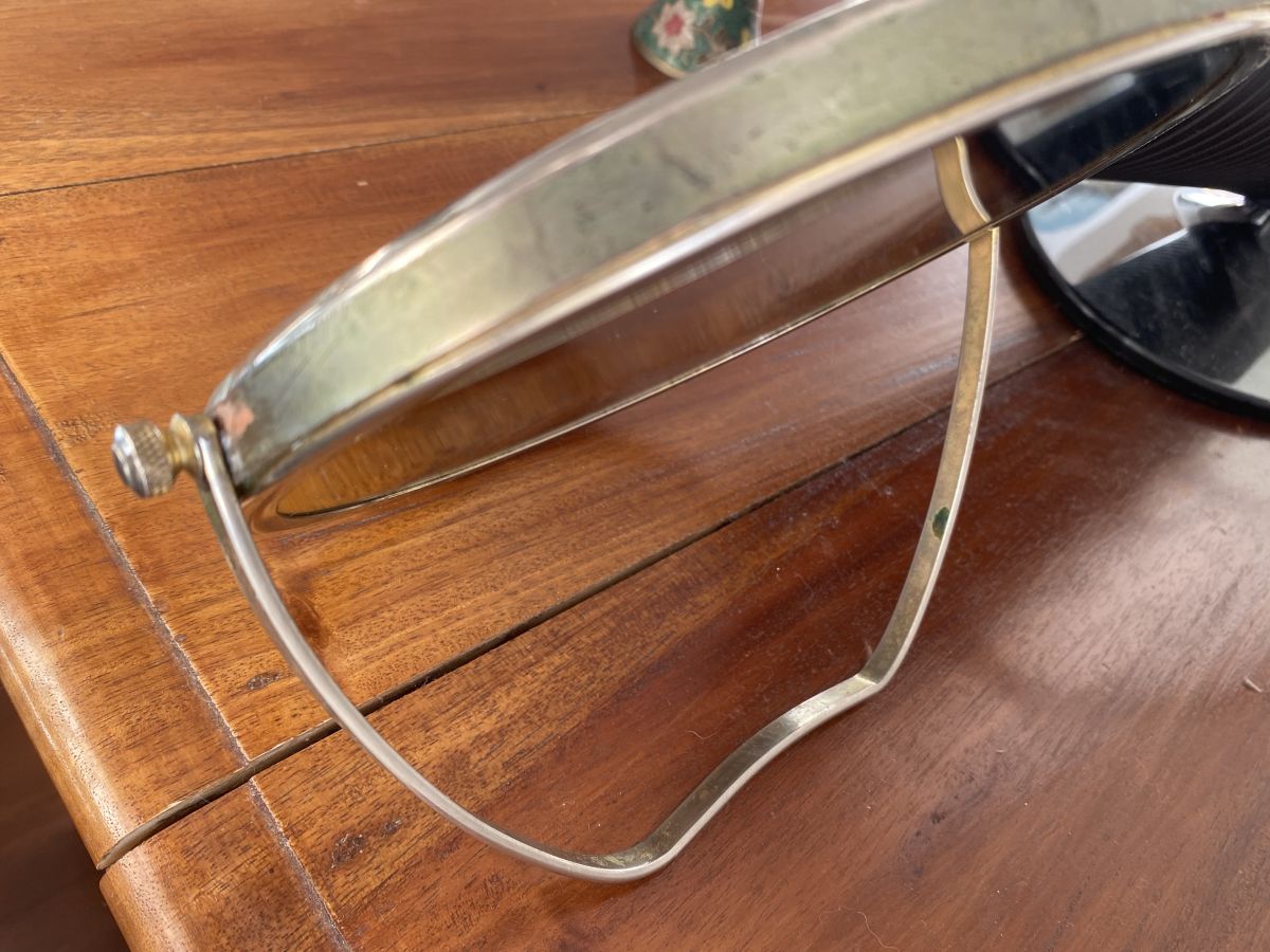 Miroir rond vintage en métal argenté qui peut se poser ou se suspendre.Une face grossissante.Traces d usage sur le métal ( photos)