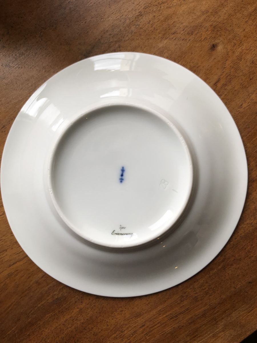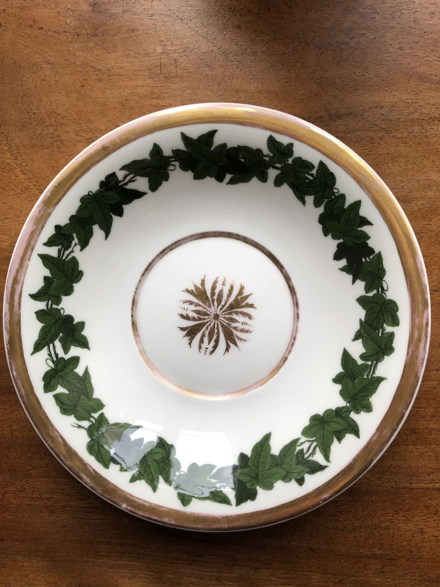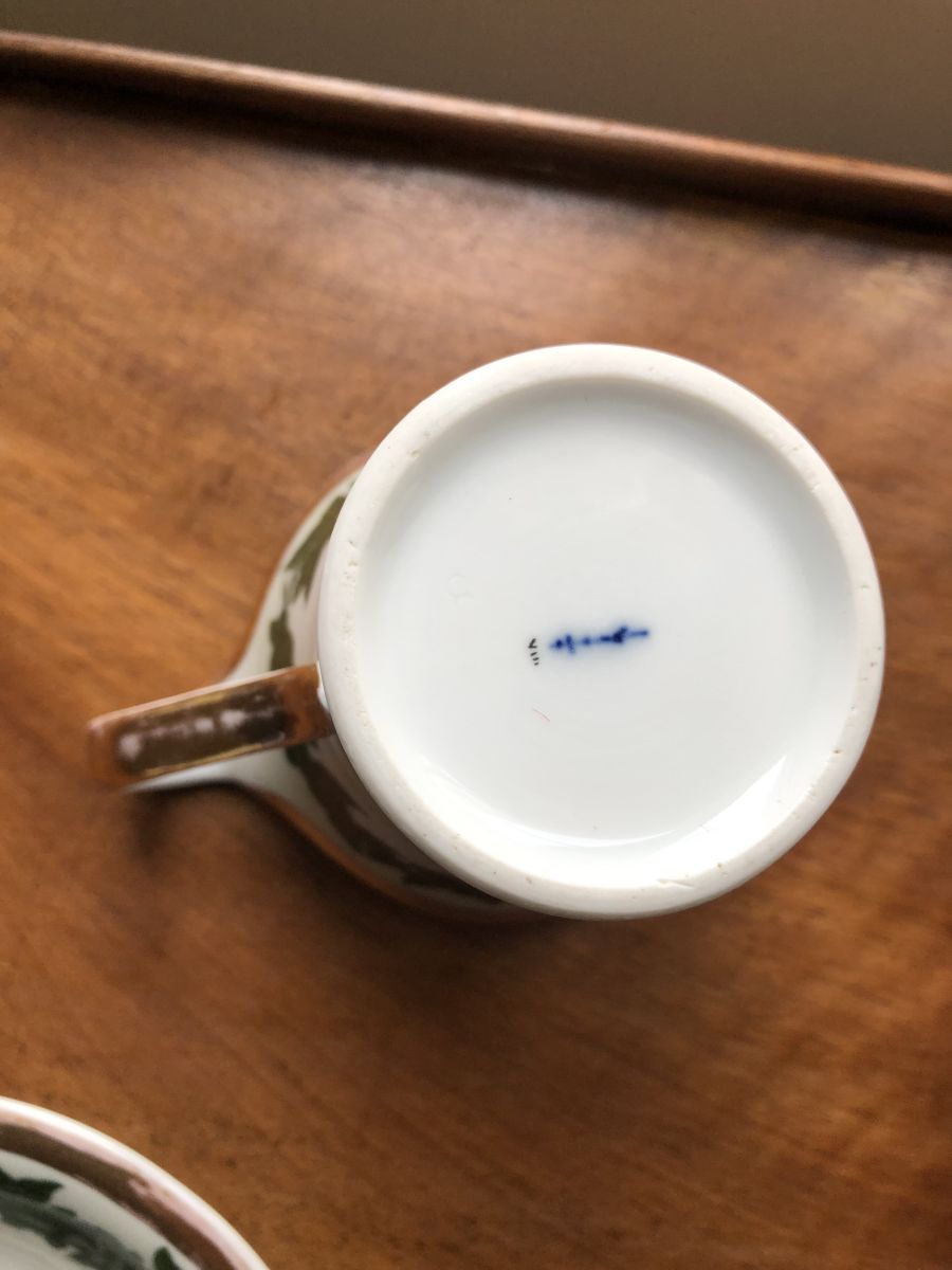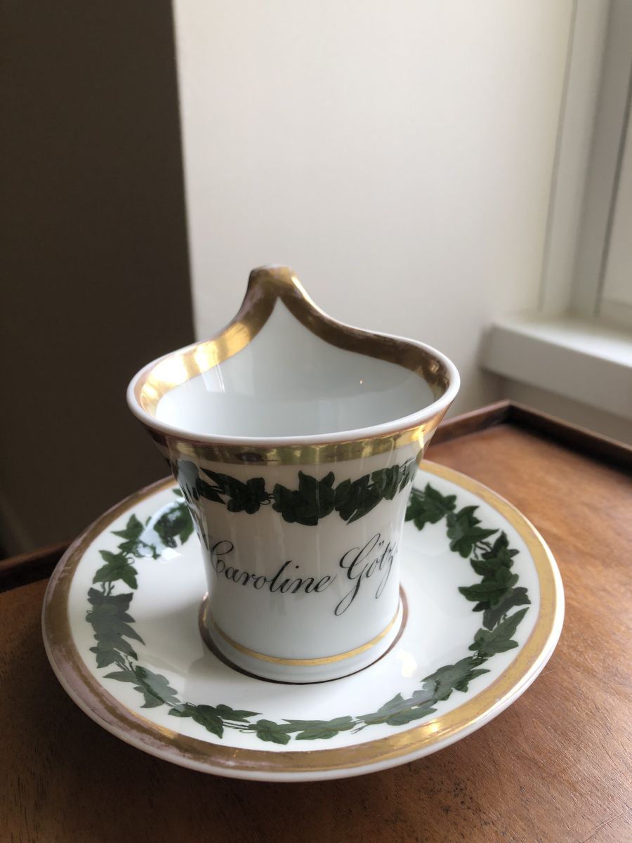 Jolie tasse à café bavaroise. Inscription Caroline Gotz sur l’avant. Décor de feuillage. Pas de fêle ni d’ebrechure mais quelques manques de dorure.