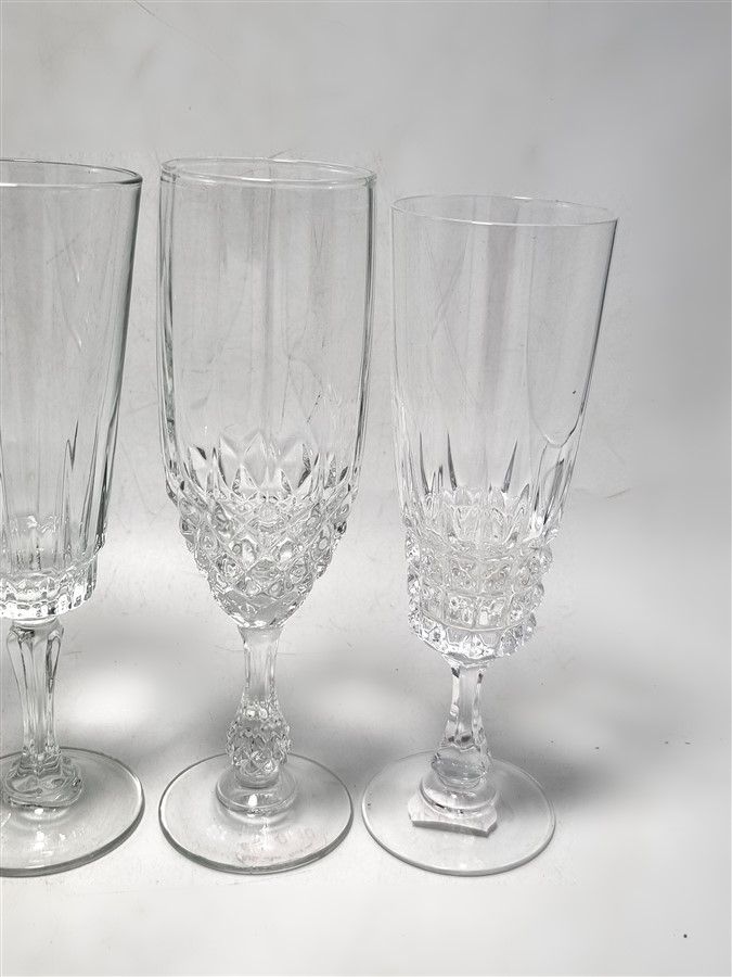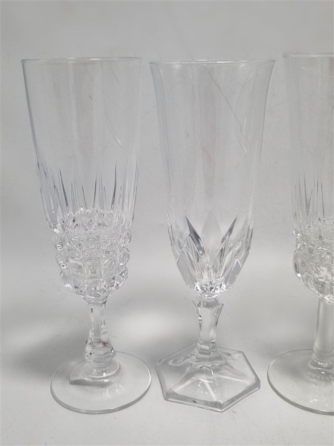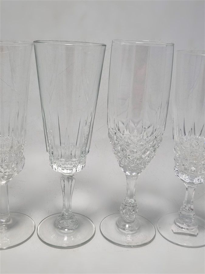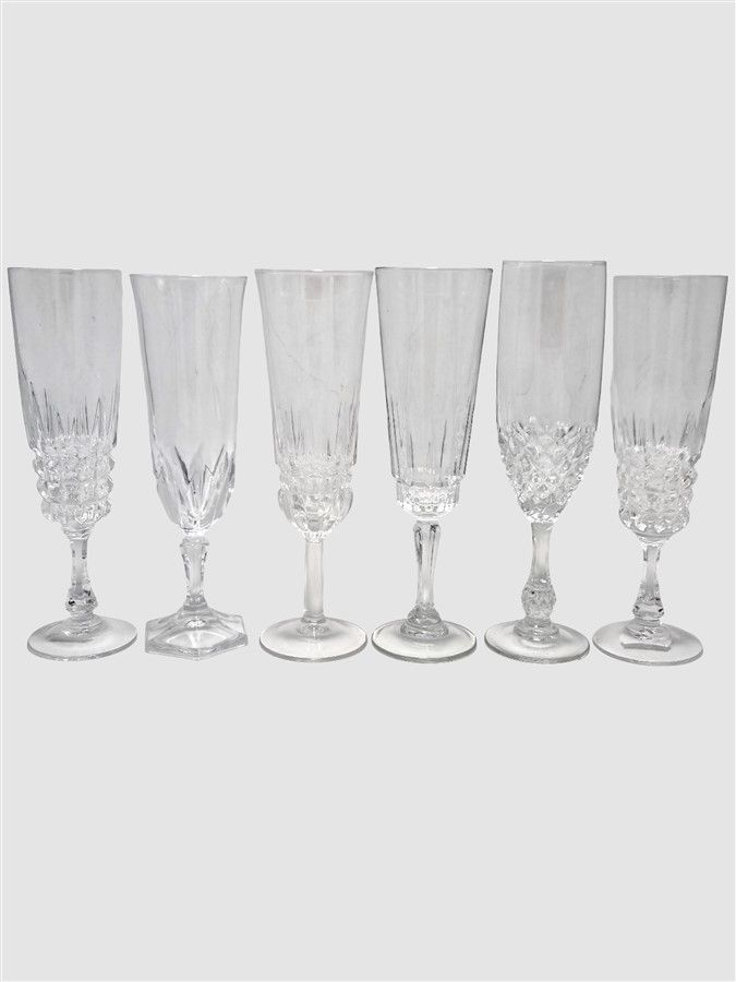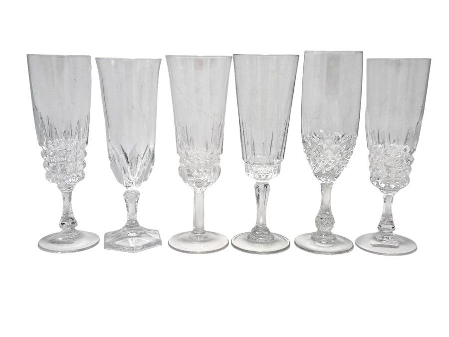 Ensemble de 6 flûtes à champagne dépareillé, certaines sont en verre, d'autres en cristal, 2 sont identiques. L'une d'elle porte un léger voile opaque, sinon elles sont toutes en bon état.