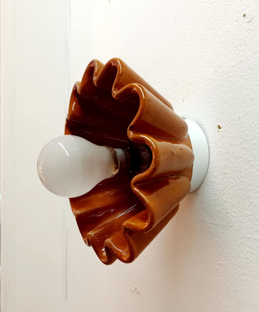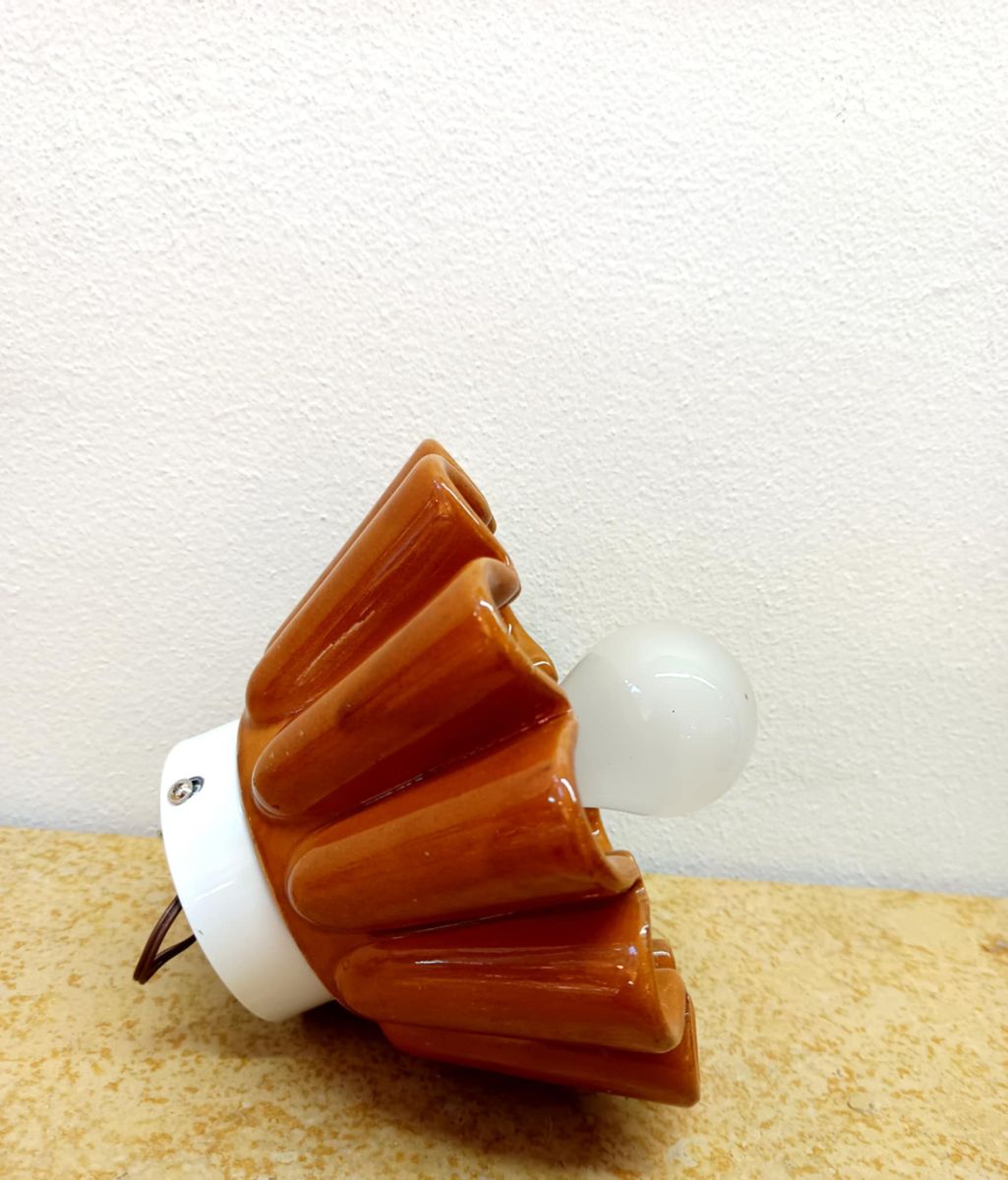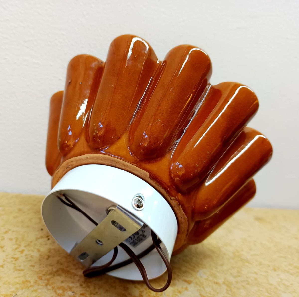 Applique composée d'un moule à gâteaux ancien en poterie émaillée de couleur ambrée. Monté à l'électricité : douille B22, pavillon en métal blanc neuf.