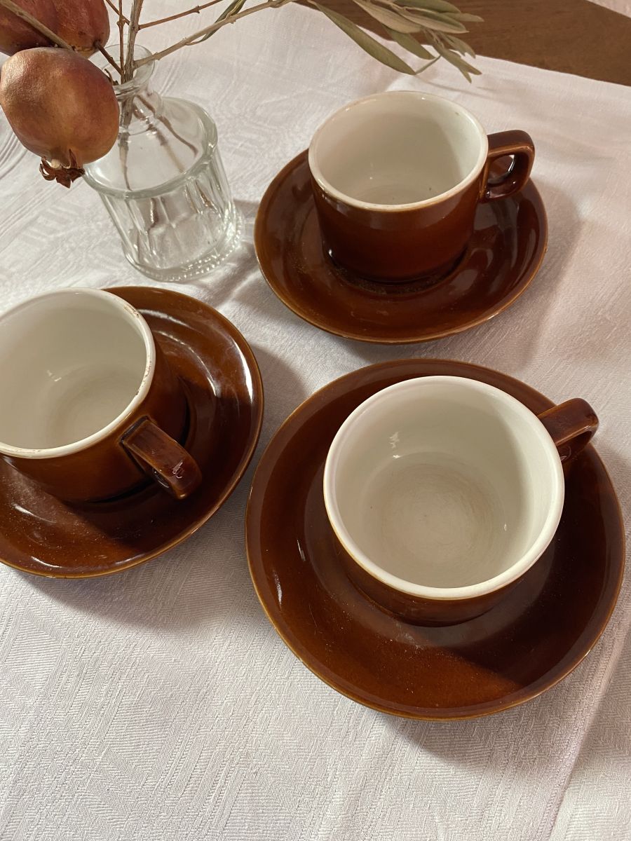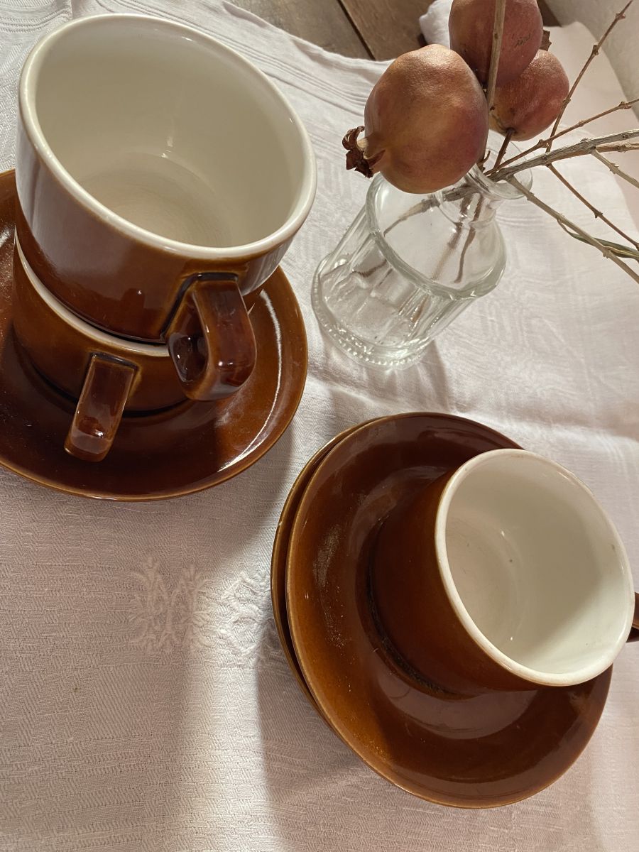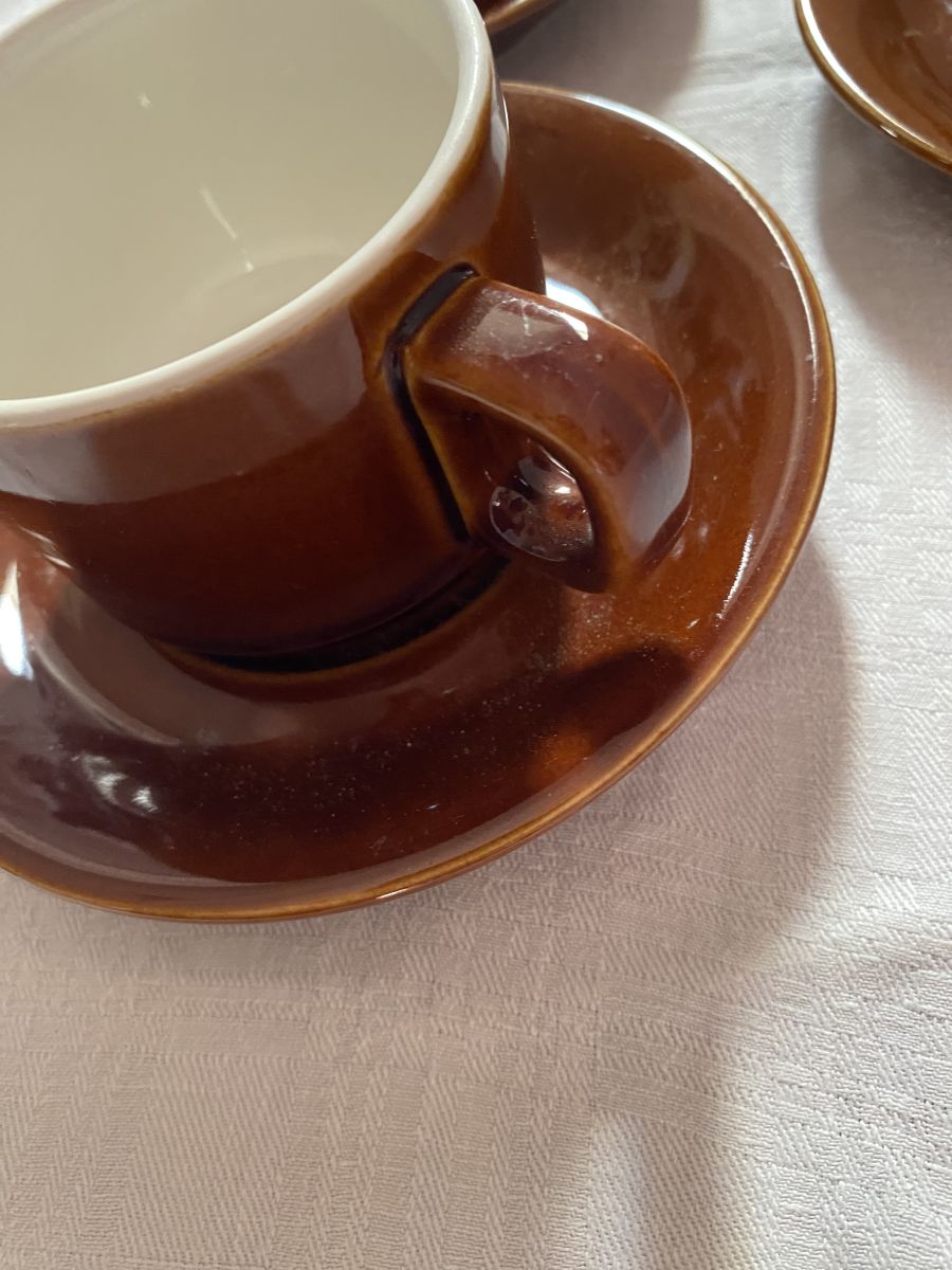 Diamètre tasse 9 cm, + anse,profondeur 7 cm.Sous-tasse 16 cm.