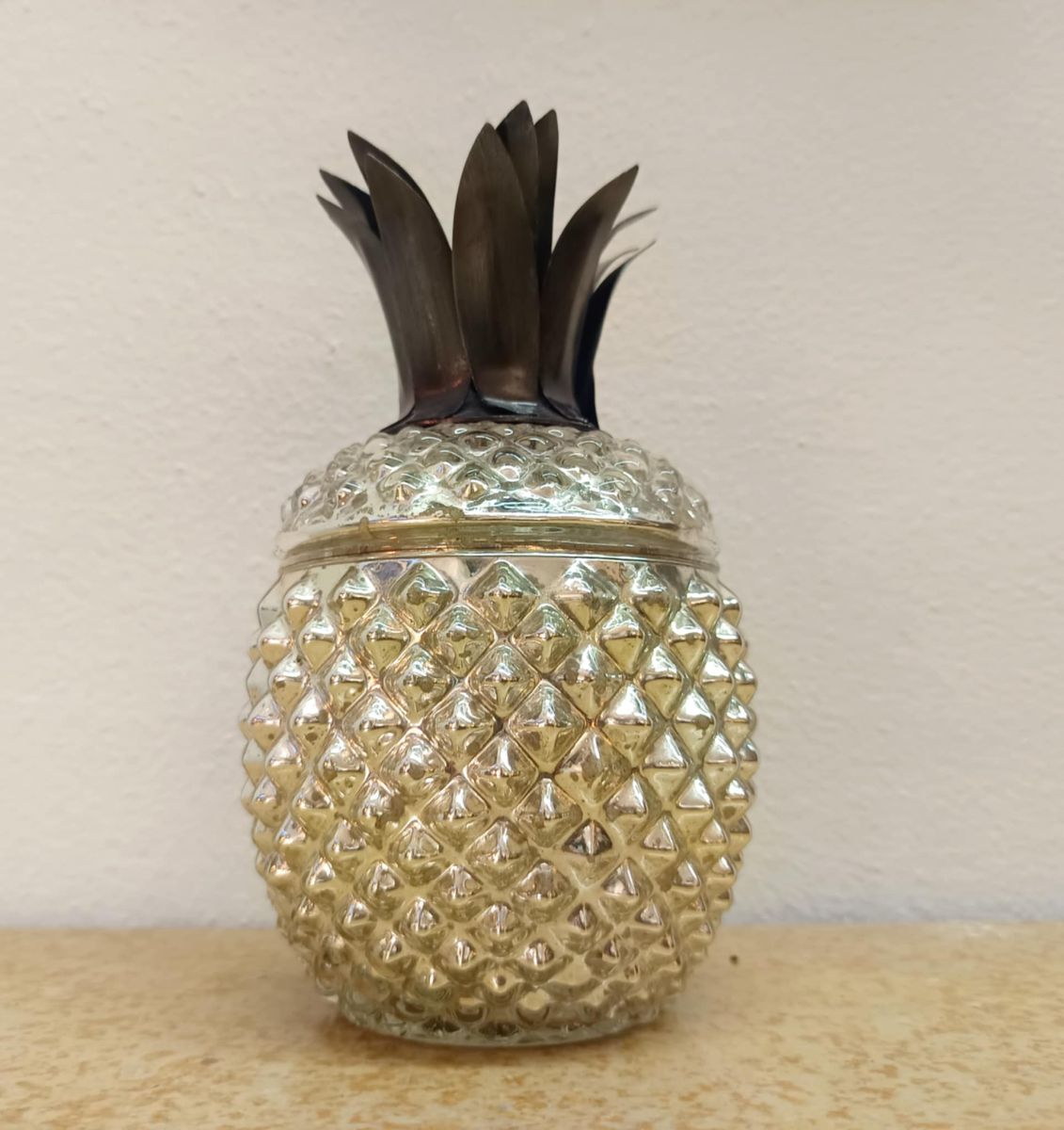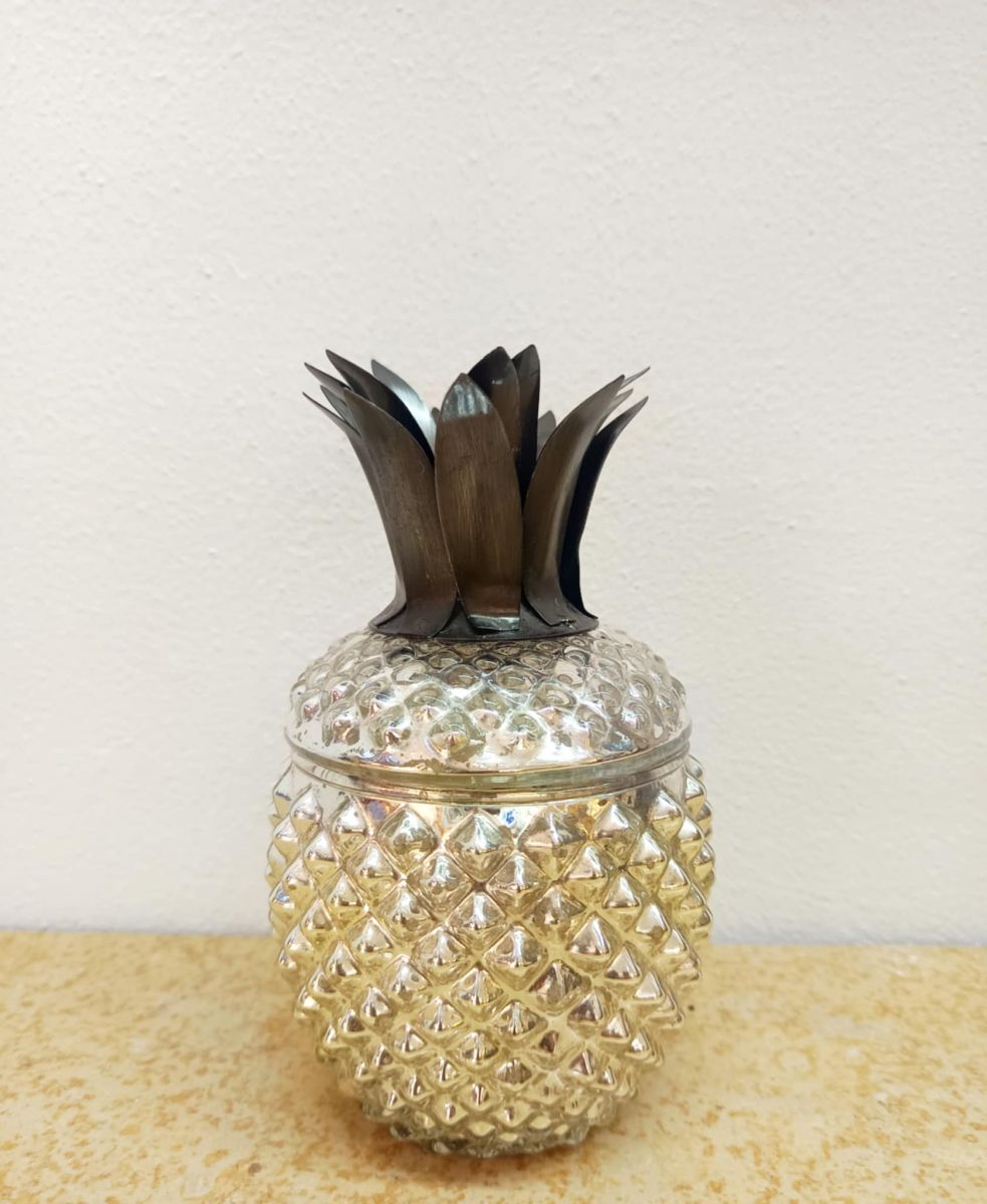 Bonbonnière en verre églomisé (argenture à l'intérieur du verre), formant un ananas, la verdure supérieure formé par des lames de métal pouvant faire également office de bougeoir.
