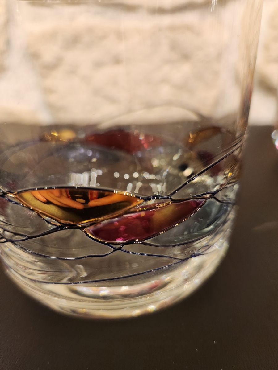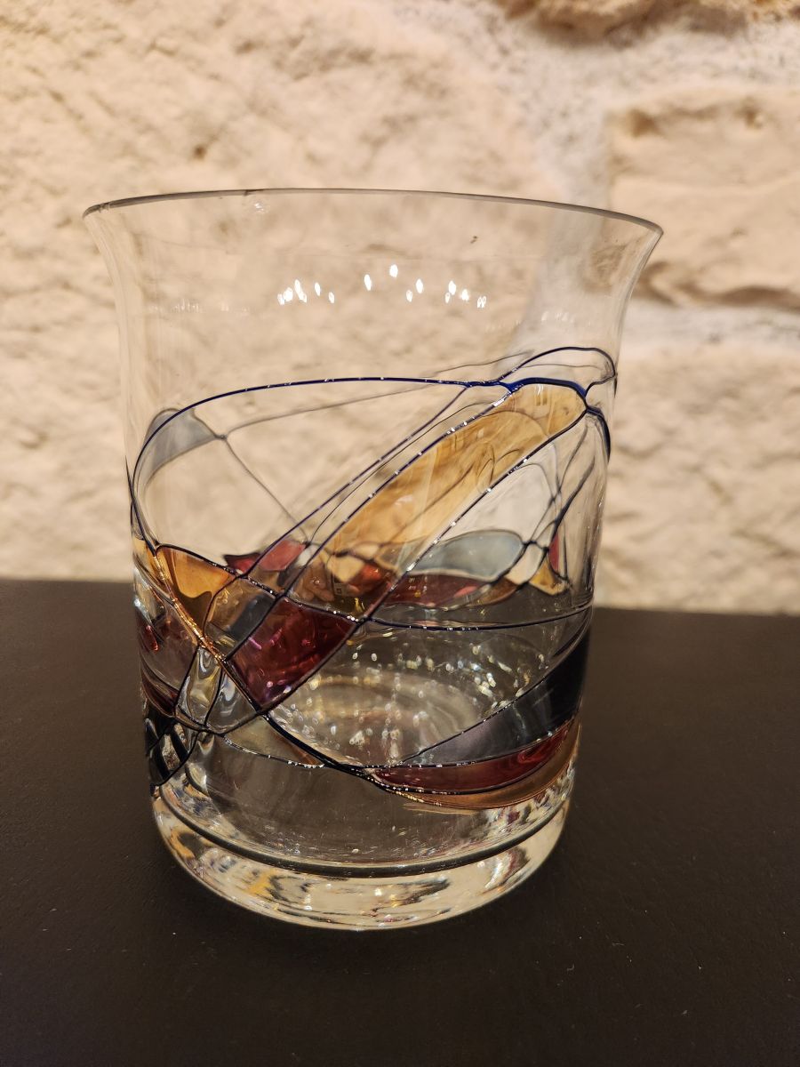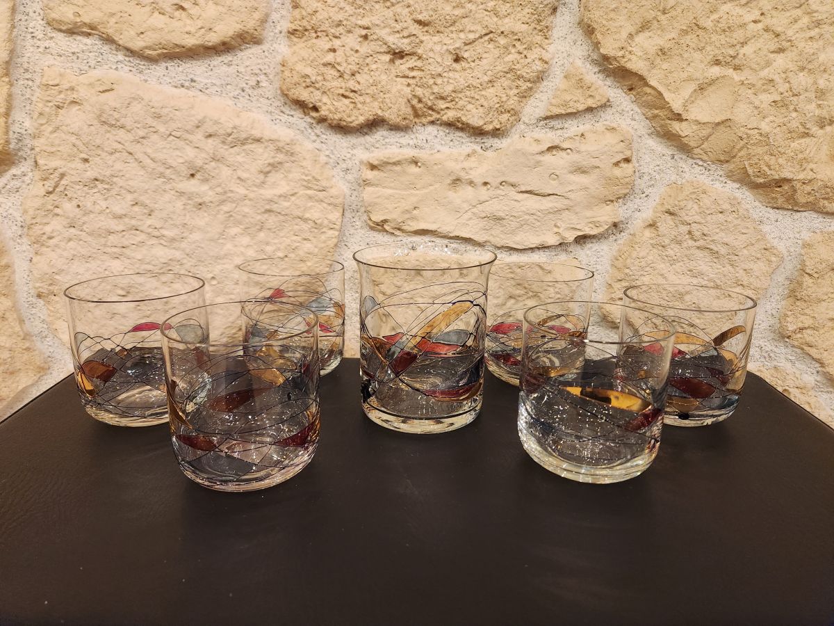Ensemble rétro composé de 6 verres décorés (très bon état) et d’une carafe assortie (ébréchée). Décor typique du Cristal de Paris, idéal pour les amateurs de déco vintage et de beaux apéritifs.