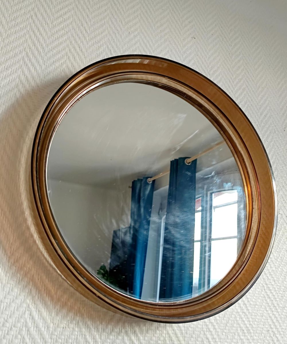 Miroir rond structure en Plexiglas fumé avec glace ronde en son centre.