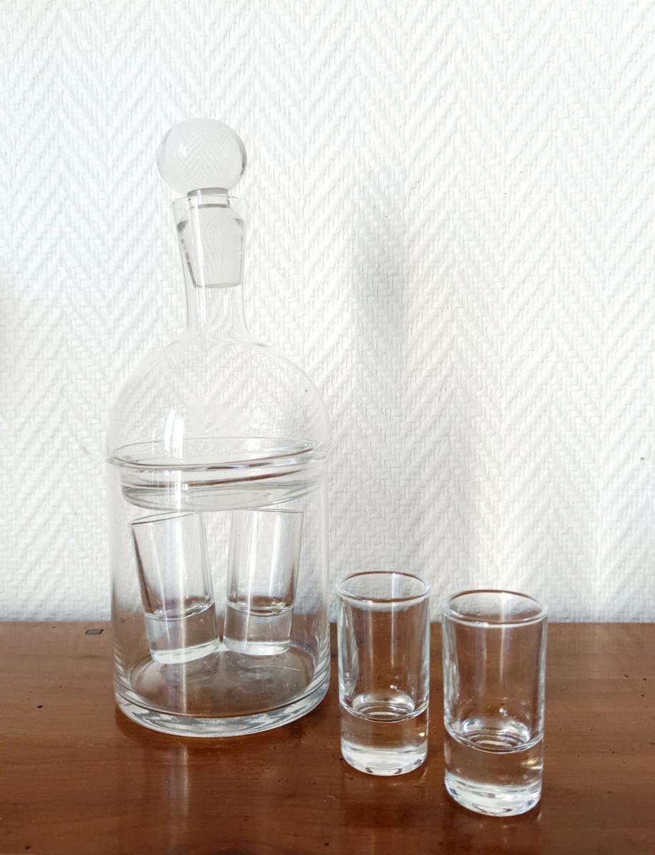 Service à whisky en verre original: la bouteille s'ouvrant en deux permet de ranger les quatre verres à liqueur à l'intérieur.