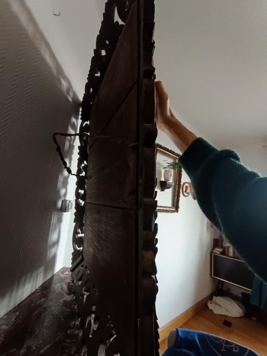 Grand miroir en chêne sculpté, travail dans le style néogothique vers 1940