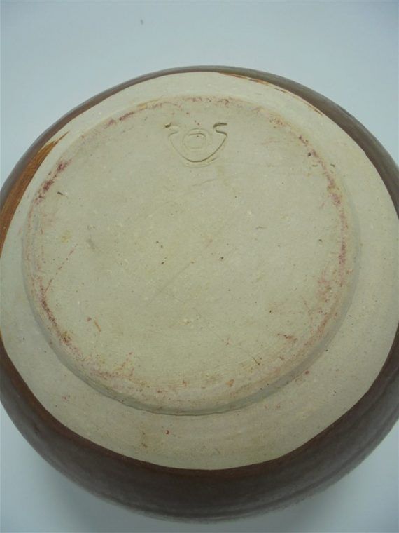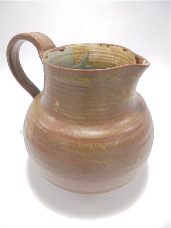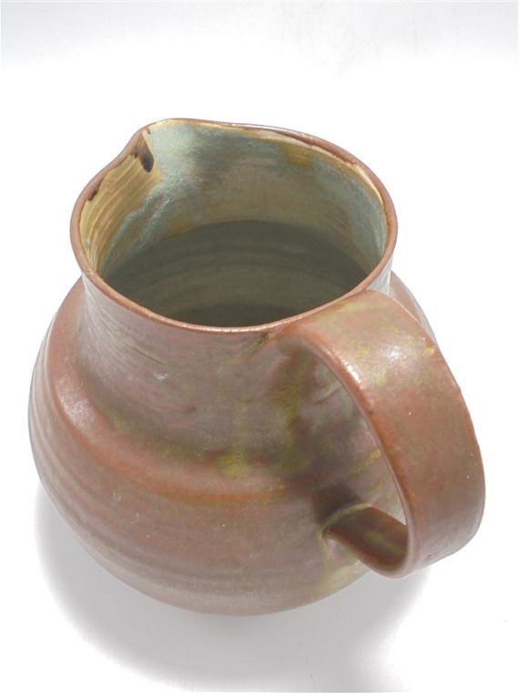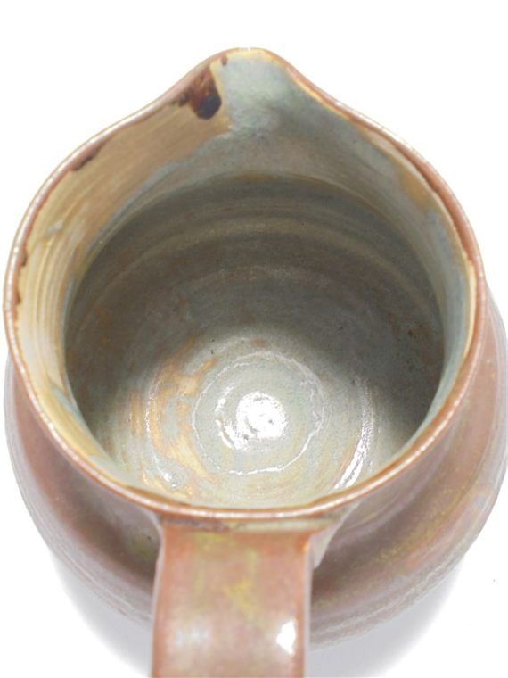 Broc en grès, de couleur brune, intérieur turquoise et crème.