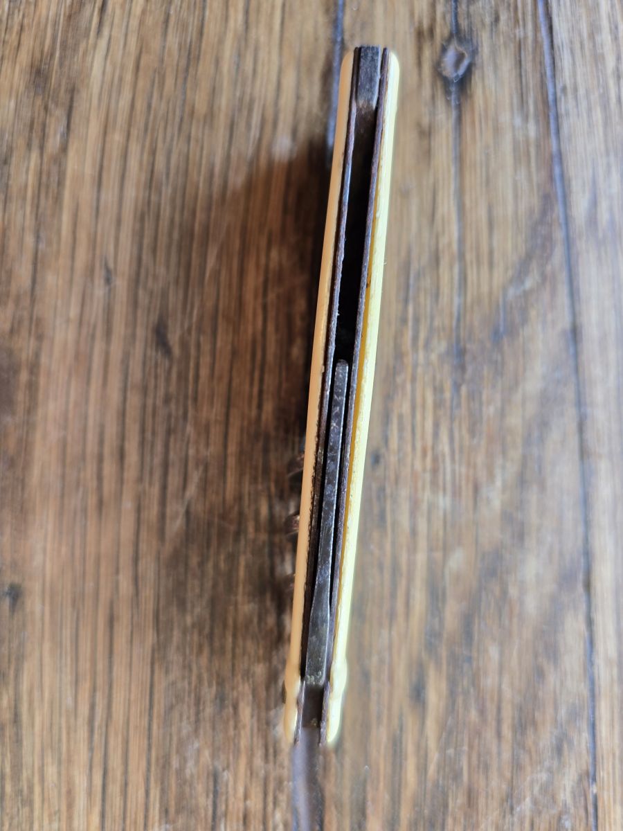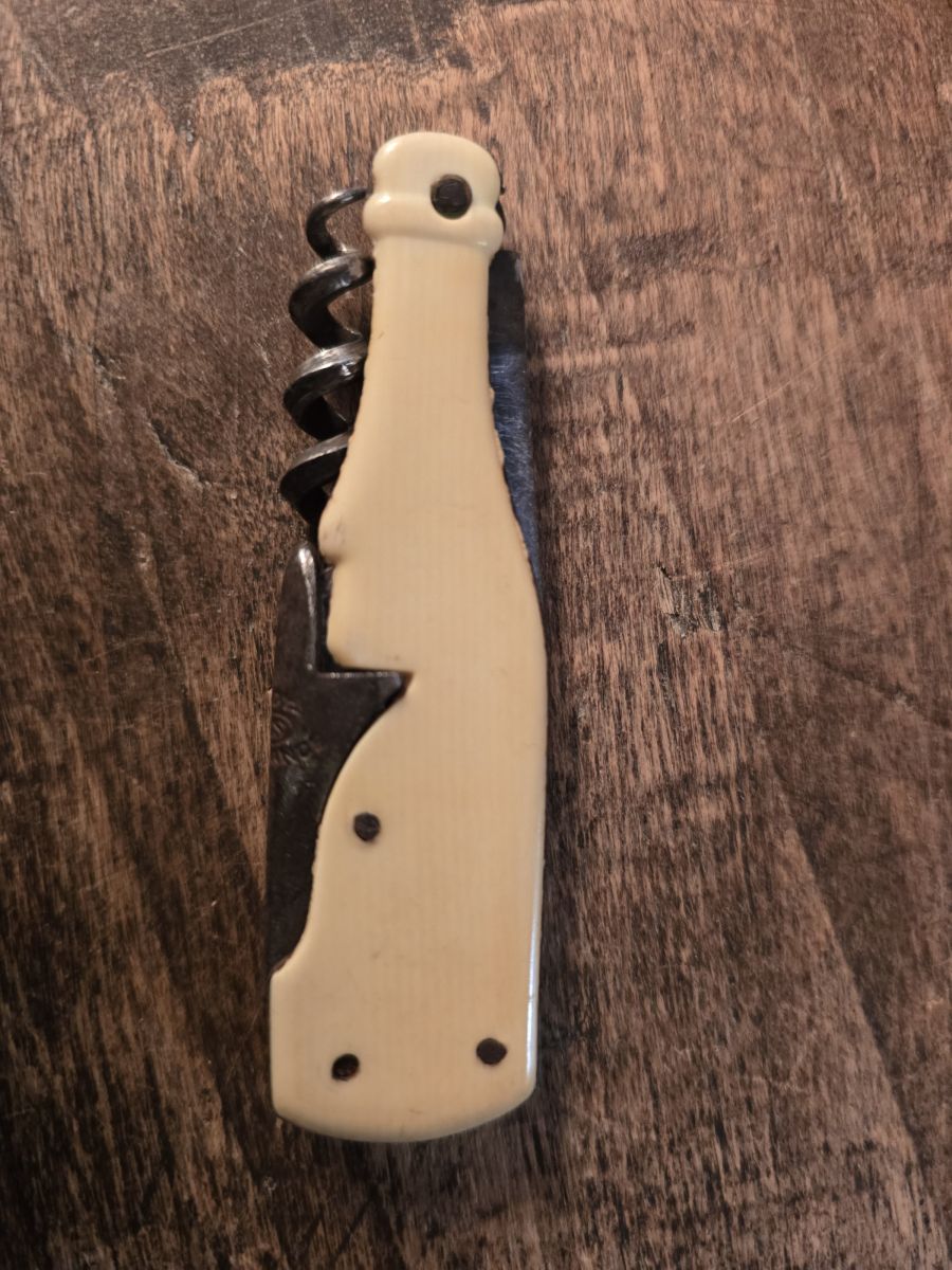 Limonadier ancien comprenant un tire-bouchon et un décapsuleur. Il possédait aussi une lame de couteau à l'origine, mais le haut de cette lame est manquant (voir photo). Les pièces métalliques sont oxydées mais paraissent fonctionnelles. Le corps de l'objet est de couleur ivoire, un peu jauni.