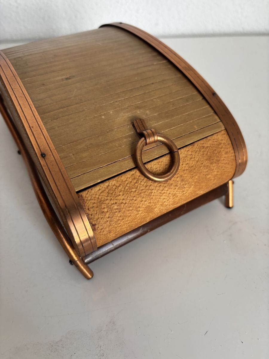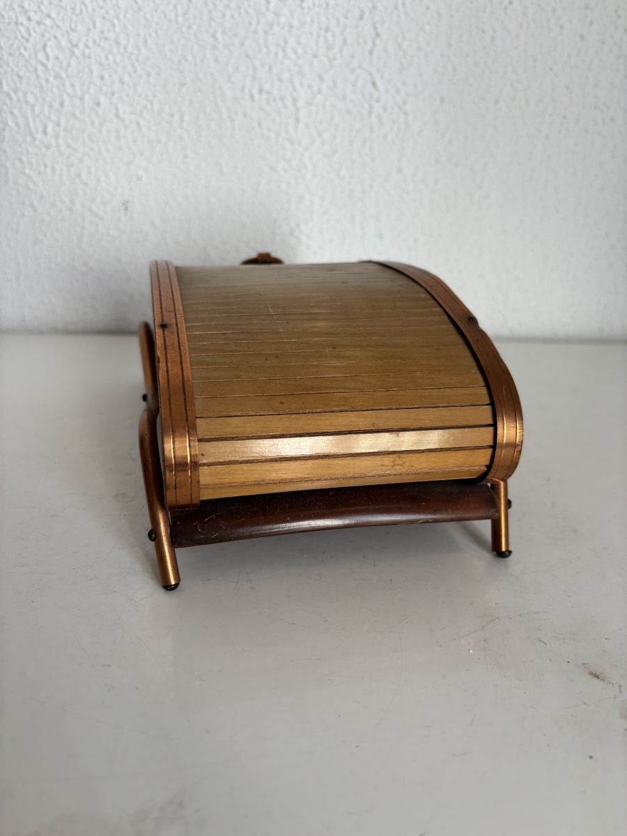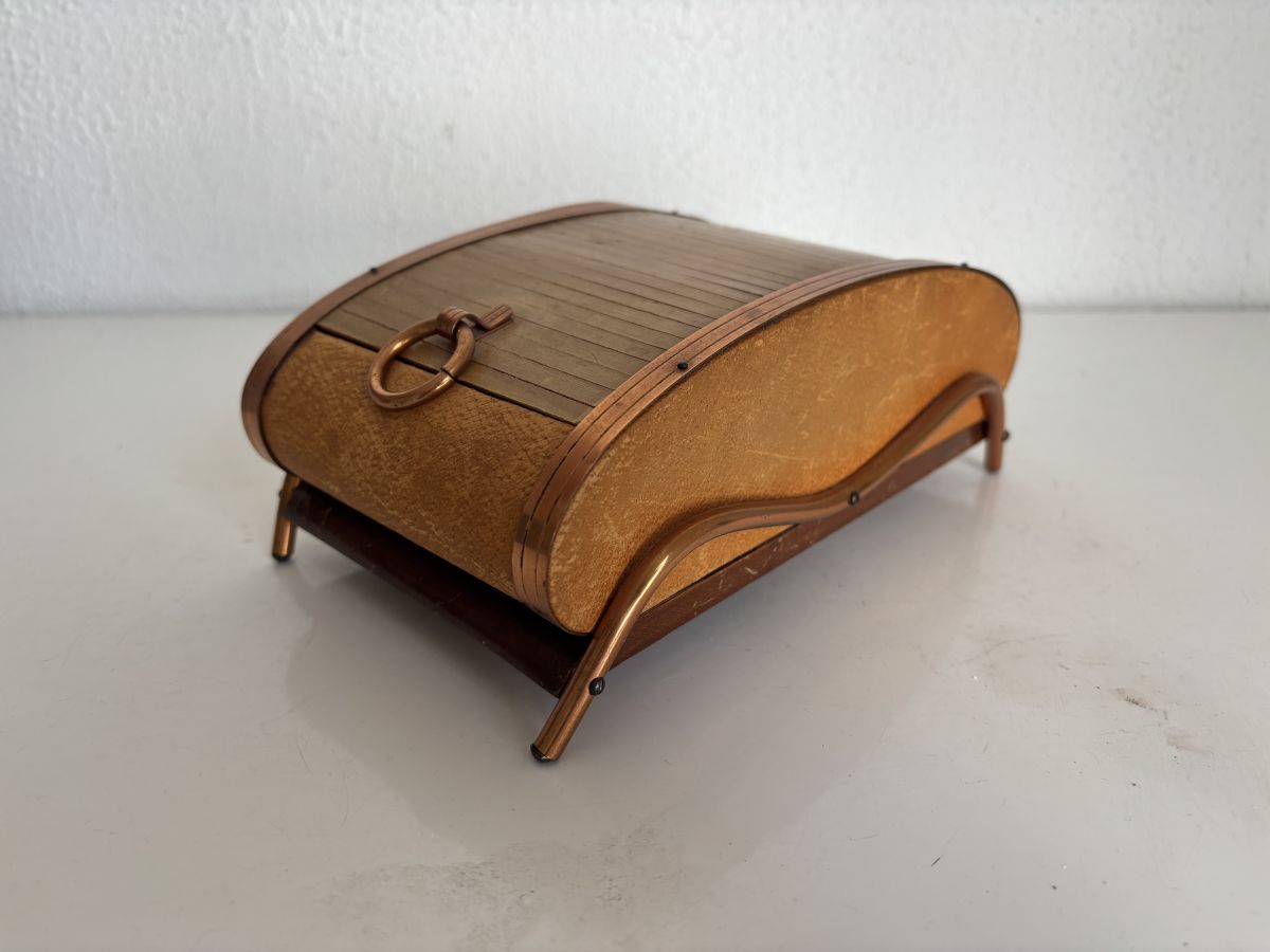 Un objet élégant d'une époque où on aimait encore faire les choses de balle façon, que du bois et du métal, zéro plastique, le rideau coulisse parfaitement, la lamelle de cuivre du côté gauche est légèrement relevée, les pieds paraissent asymétriques mais cela semble être d’origine.