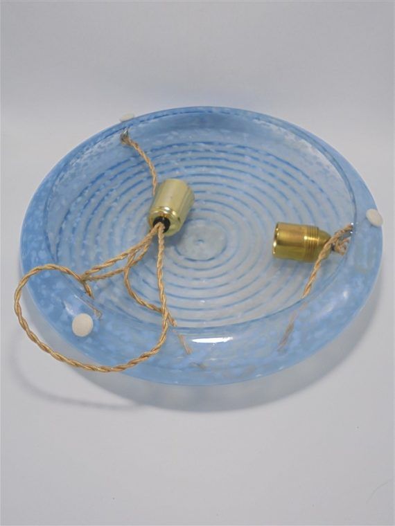 Grande suspension en verre moucheté bleu suspendue par 3 cordelettes.