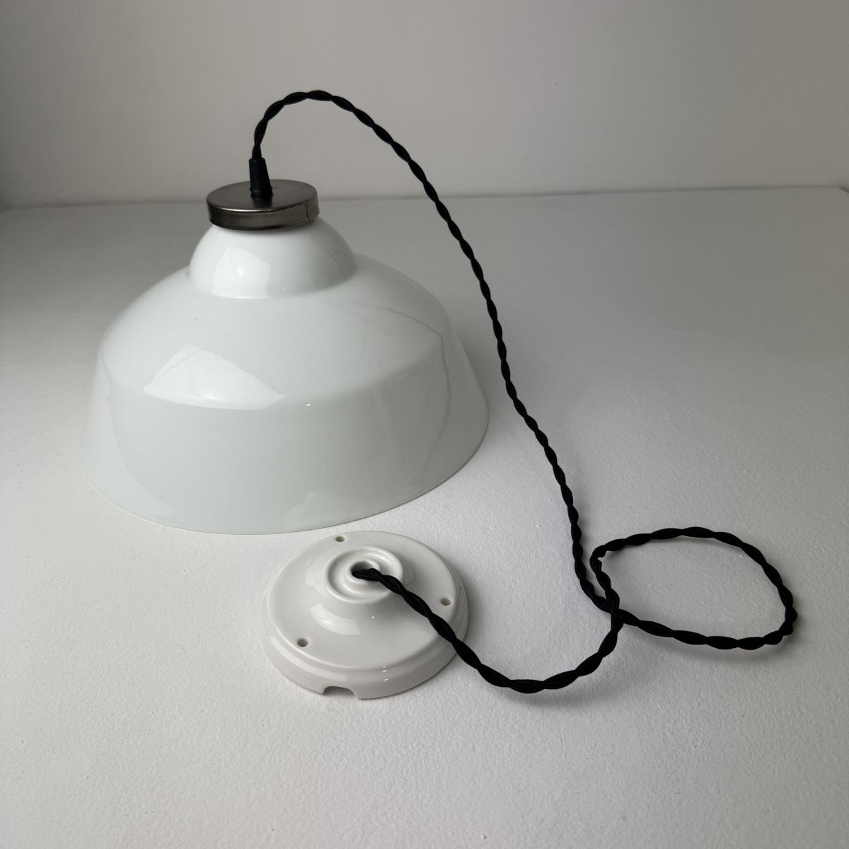 Branchement par domino. Fil noir en tissu tressé et rosace de fixation en céramique.