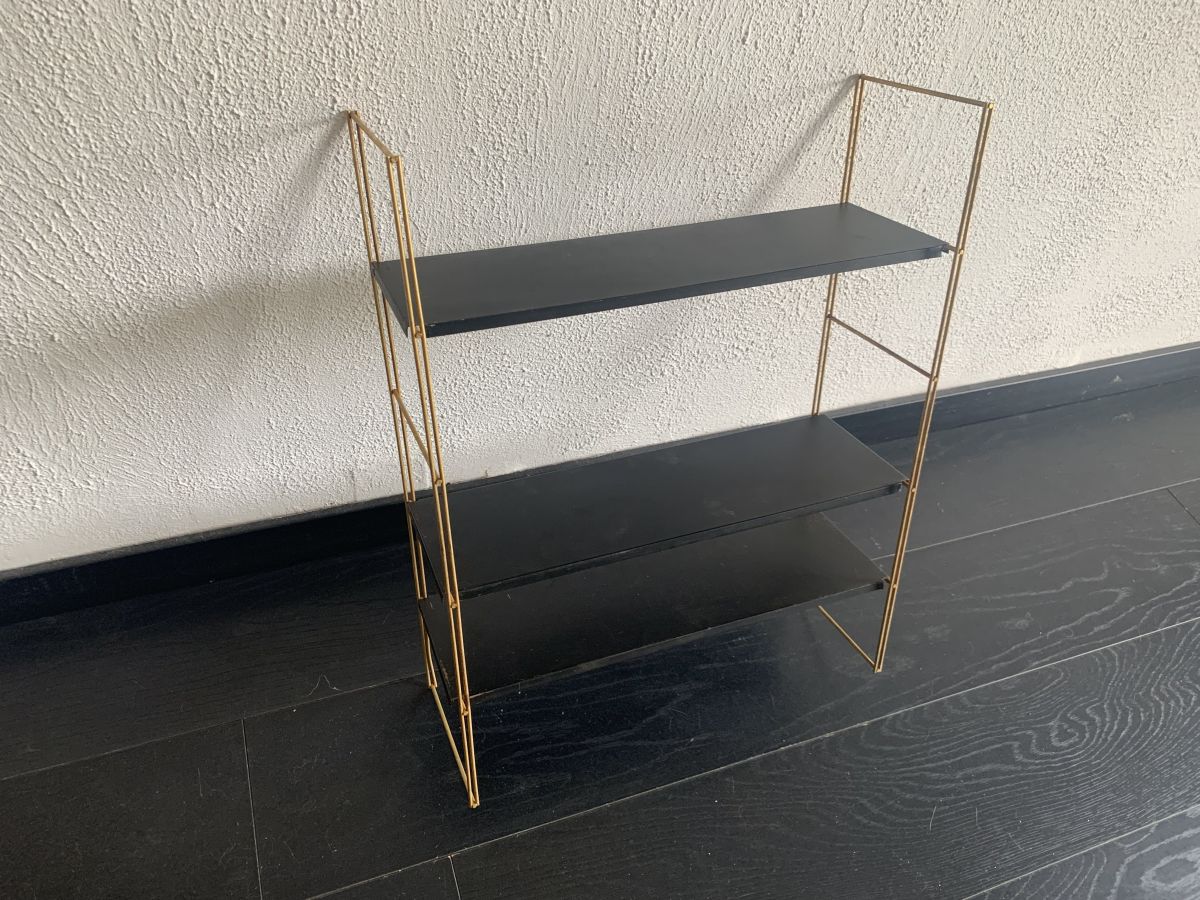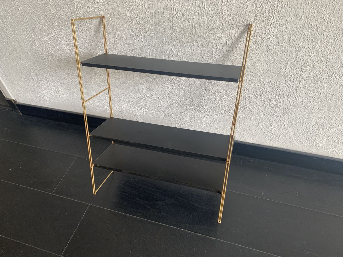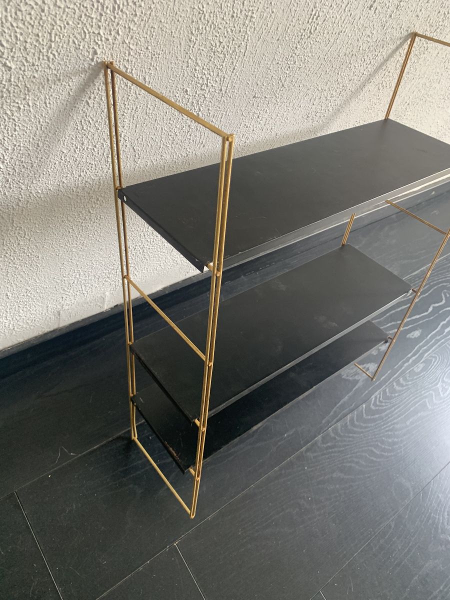 Ancienne étagère string murale (à fixer sur un mur) en métal doré et planches en tôle laquées noire circa 1960 en bon état.
