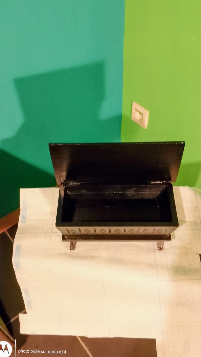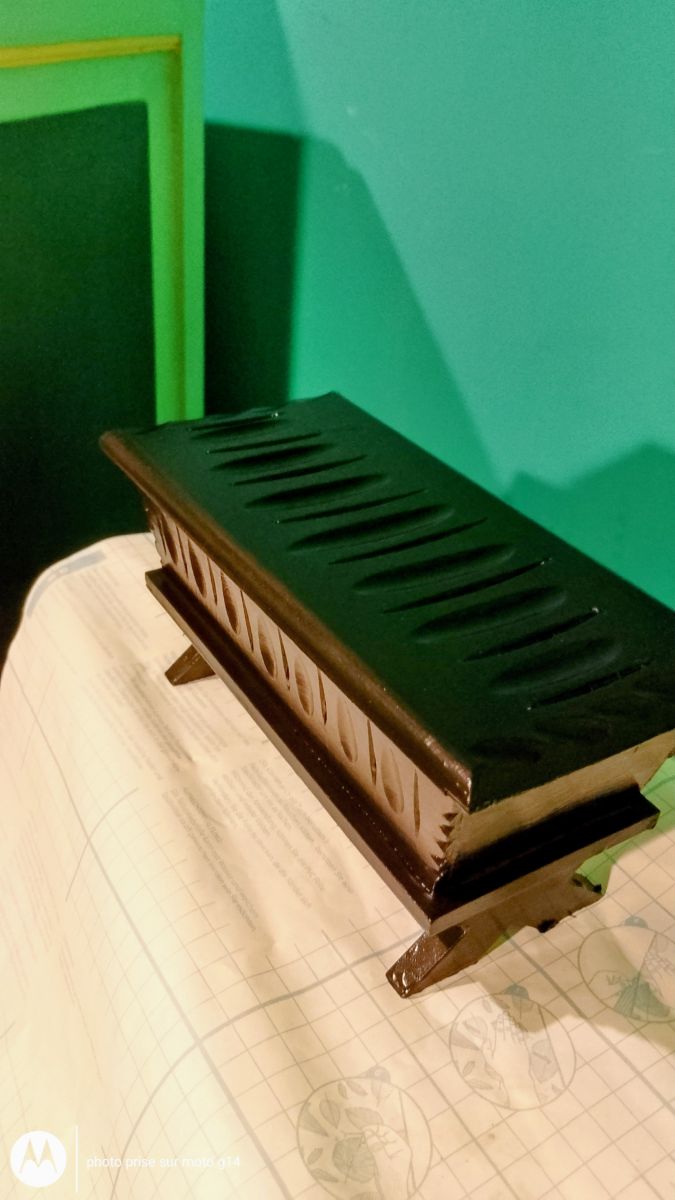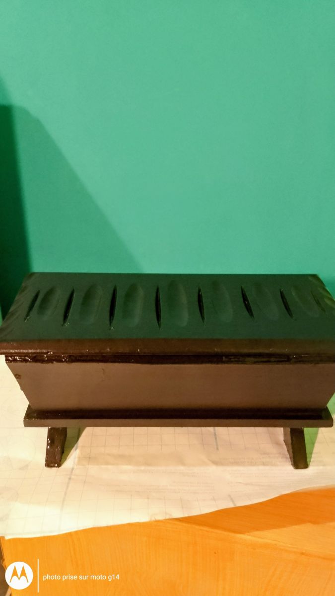 petit coffre en bois massif rainuré, repeint entièrement en noir brillant, très joli, très original
