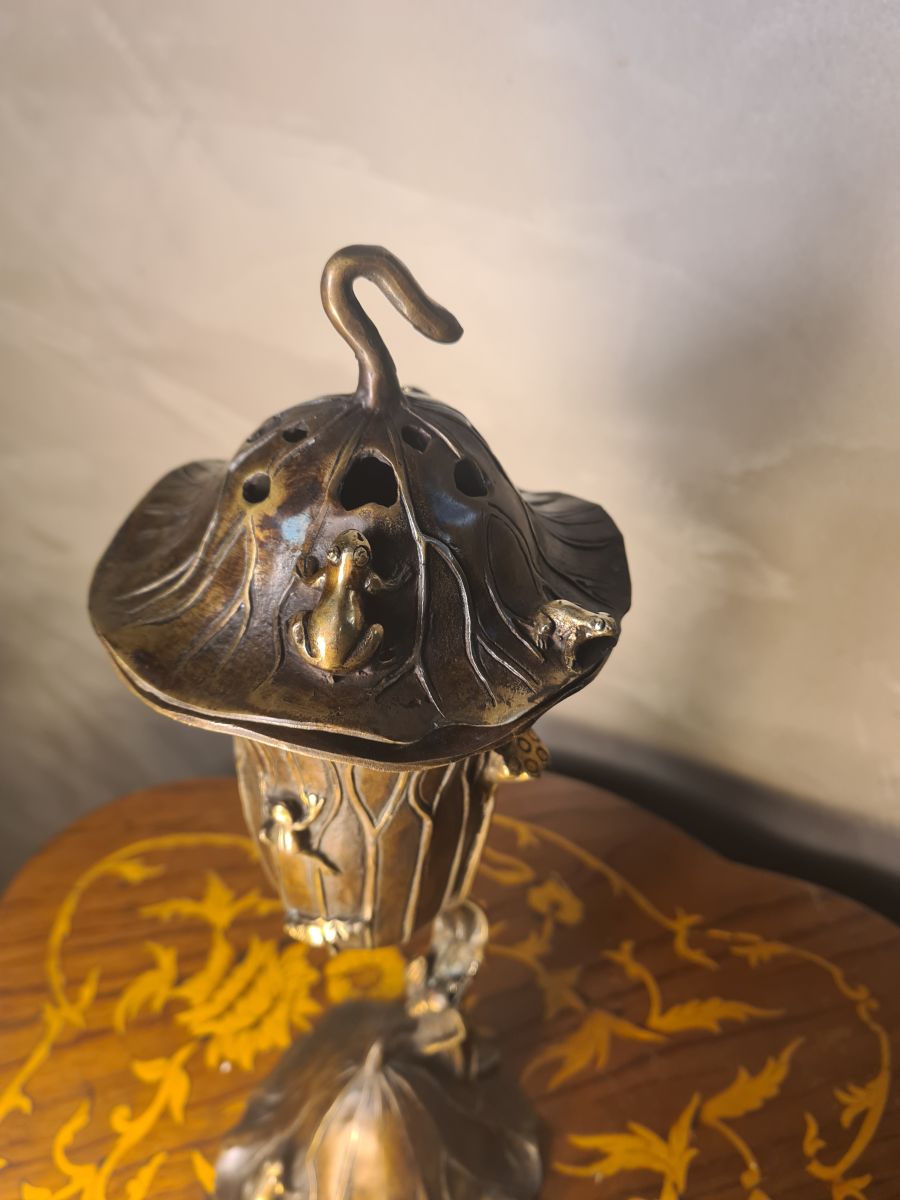 brule encens bronze art nouveau feuille, grenouille ciselé ,34x13