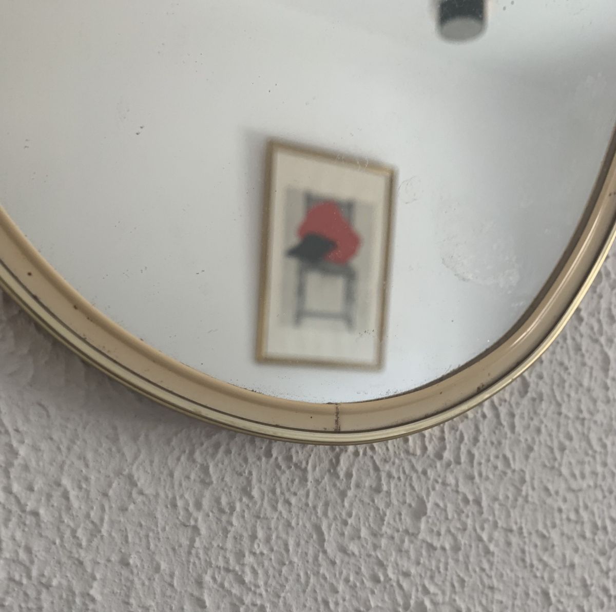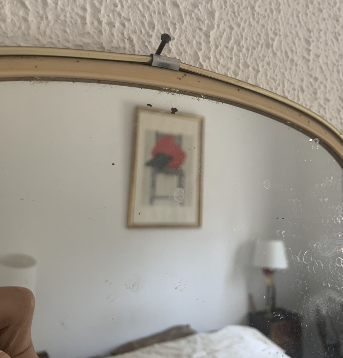 La glace est propre bien qu’elle affiche quelques mouches ça et là, le cadre est bruni sur le dessus, ce qui lui donne une patine unique.