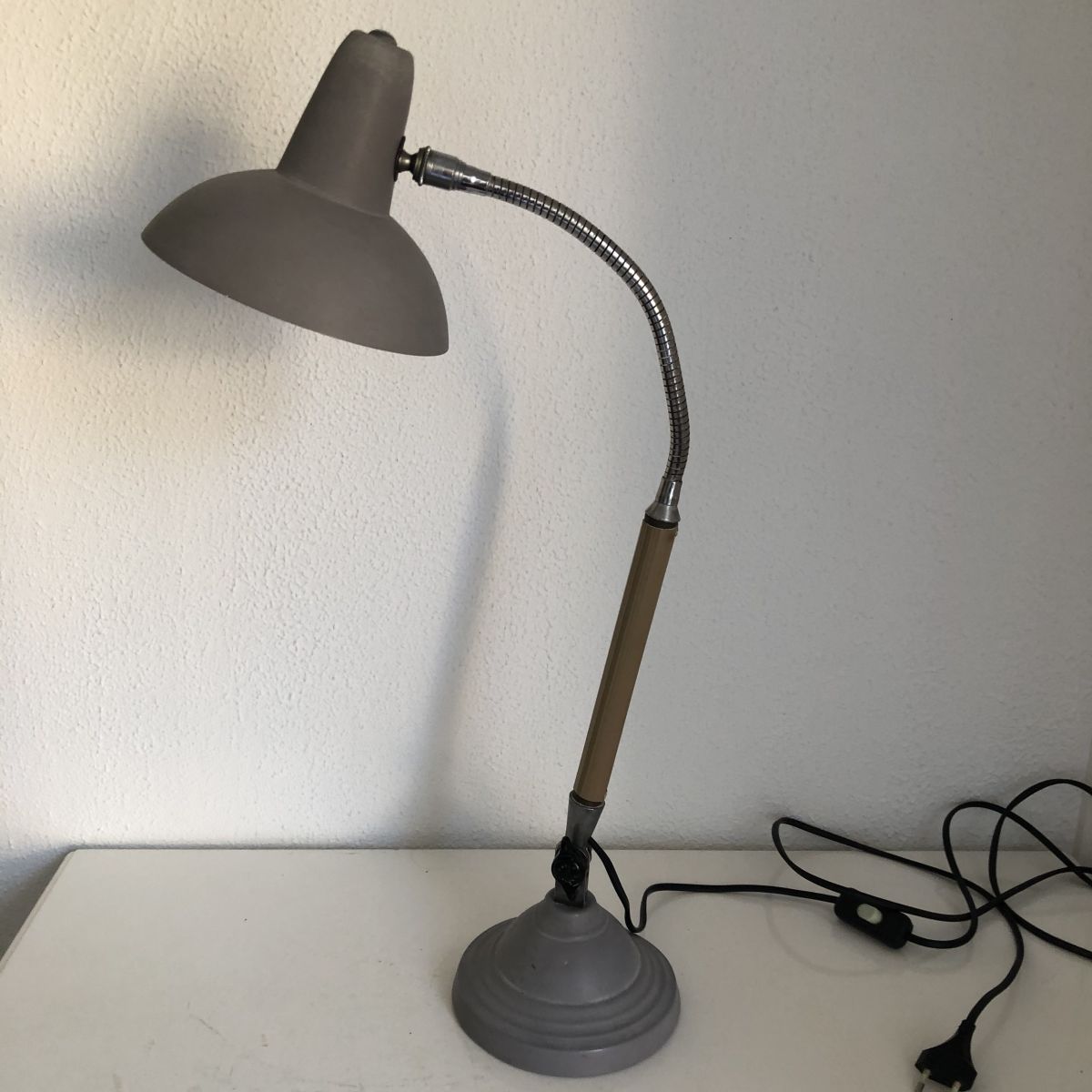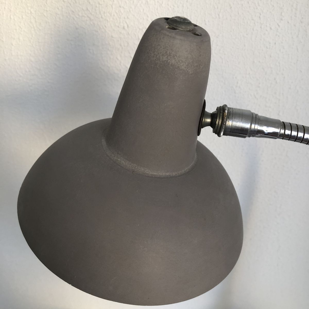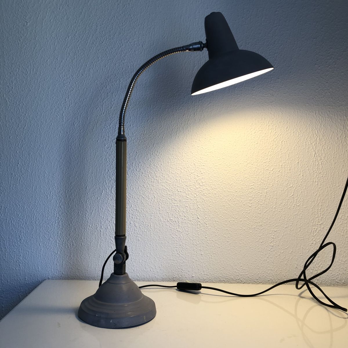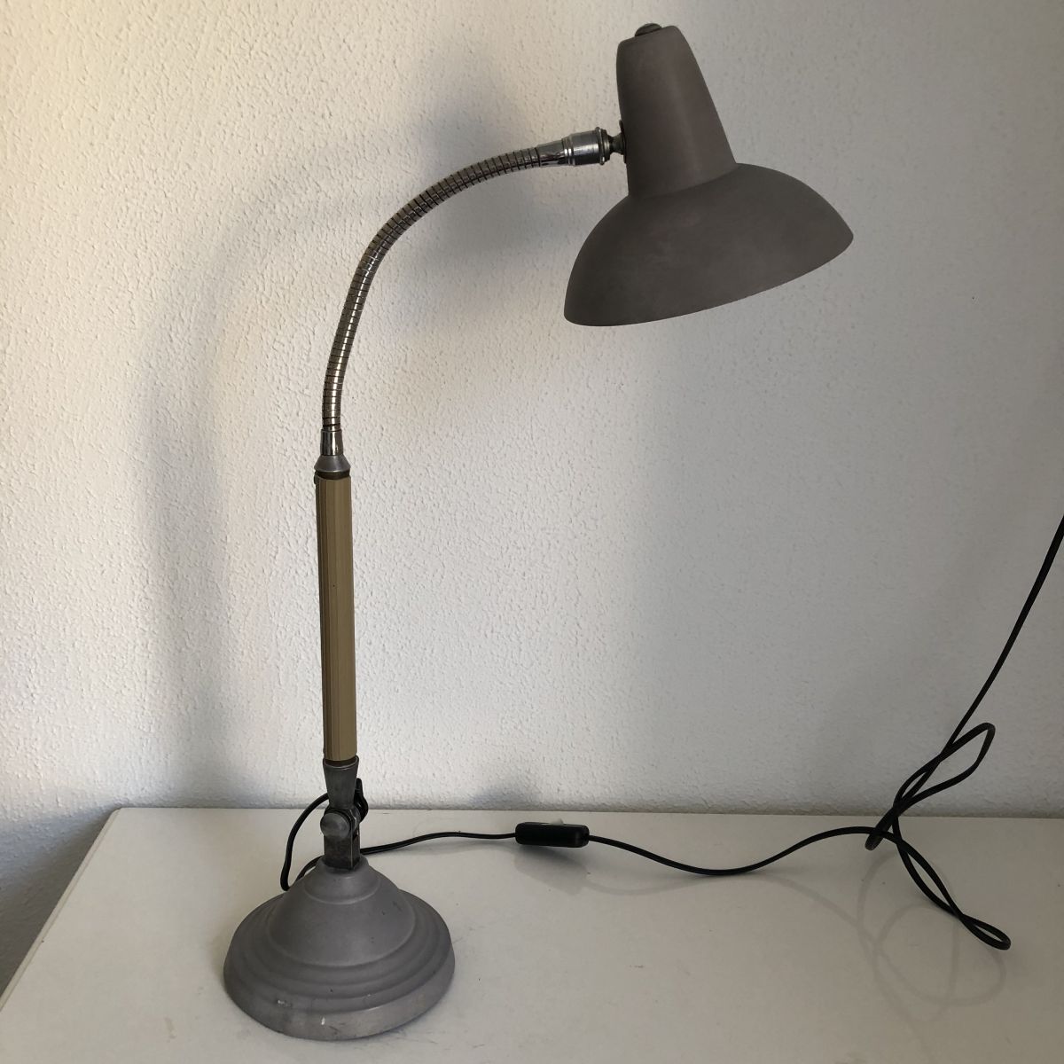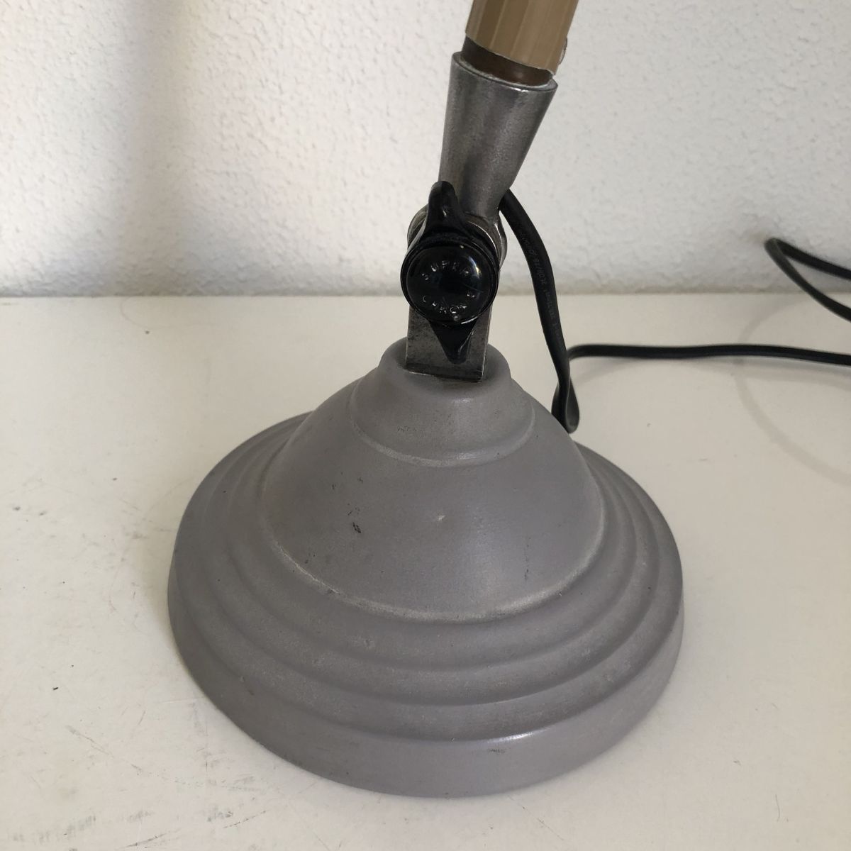 Un modèle rare et complet en superbe état, elle affiche une certaine patine et une légère déformation de la base lestée d’un côté. Elle est signée sur la molette en bakélité noire qui permet de l'orienter d'avant en arrière. La peinture grise granuleuse est superbe. La base lestée ronde est magnifique.