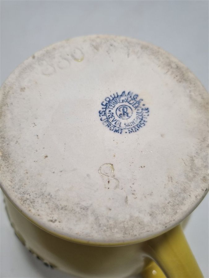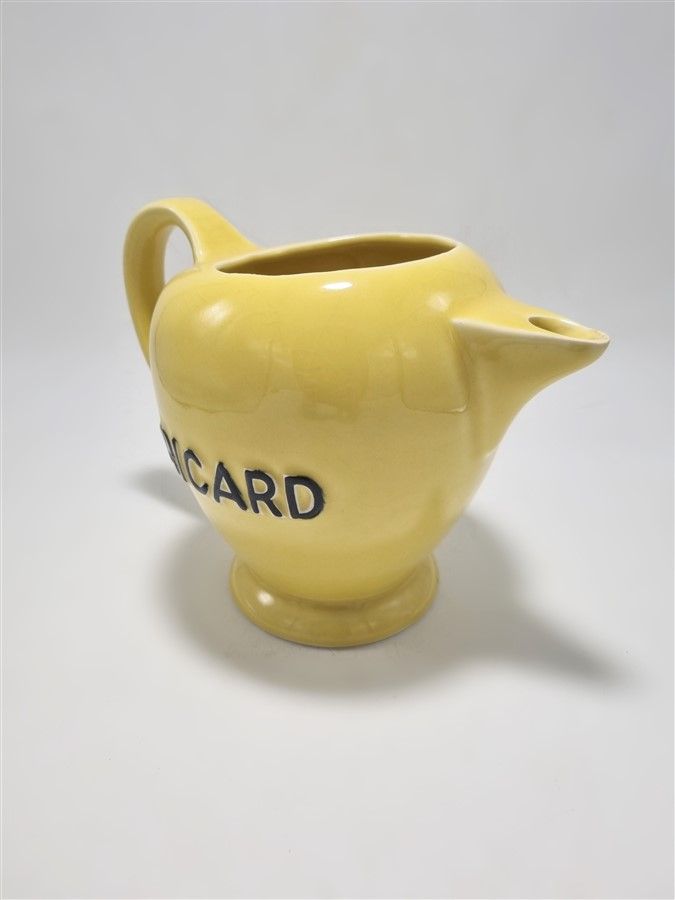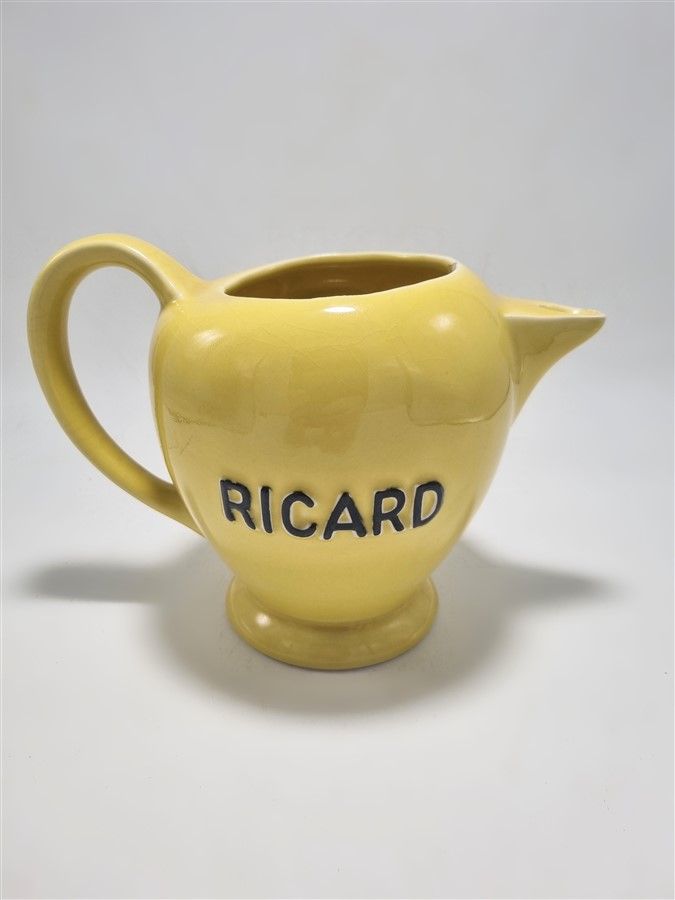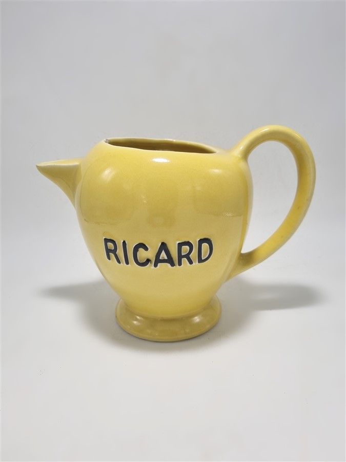 Pichet Ricard en céramique jaune. Moule 830. Tampon : Révol Terre d'Acier Saint-Uze - Coulanges St-Jérôme Marseille. L'intérieur du col présente un petit accident visible sur photo.