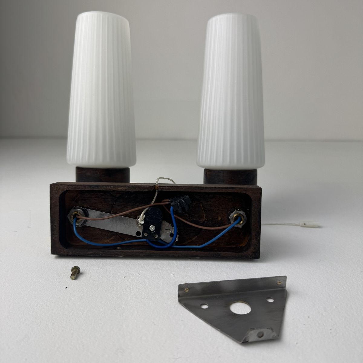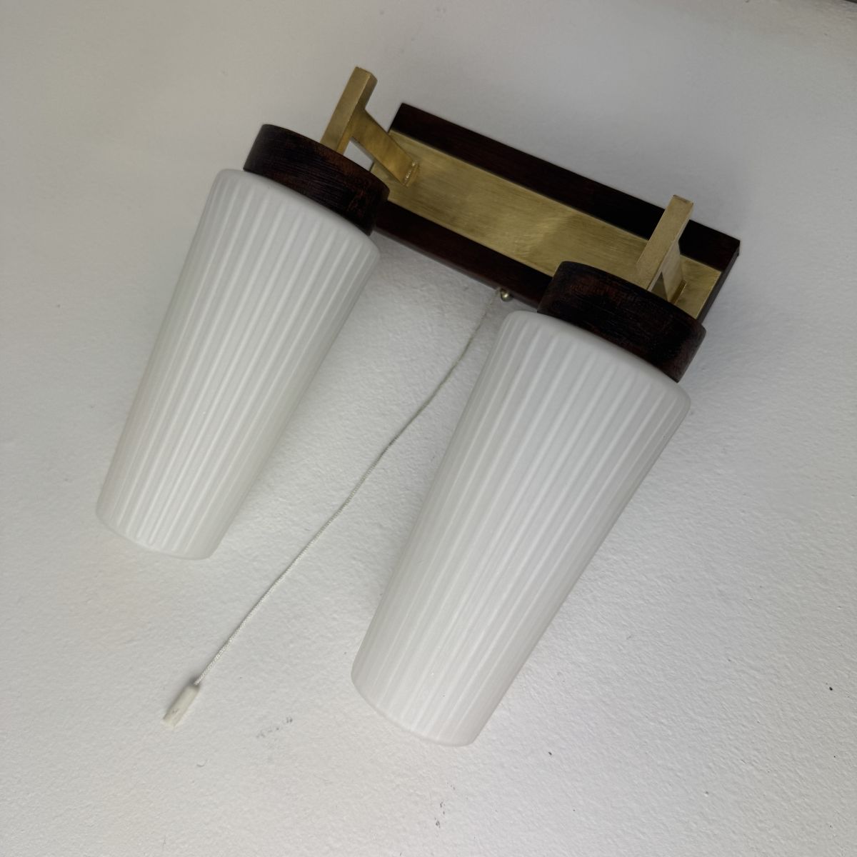Belle applique scandinave en bois et laiton. Les abat-jours sont en opaline cannelée. Interrupteur à tirette. En bel état général. Quelques traces du temps.