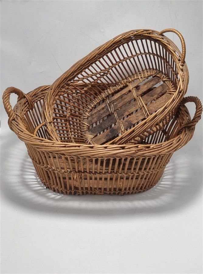 Deux petites corbeilles en osier avec poignées. Elles sont anciennes, portent des traces, principalement le fond de la petite et quelques brins sont cassés sur les 2.