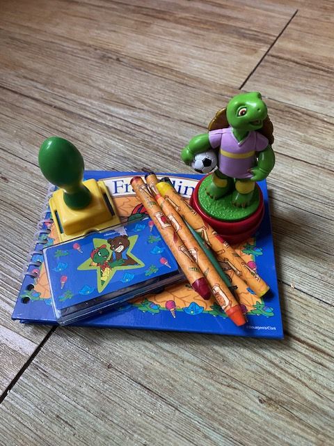 4 beaux articles. La peluche Franklin 40 cm de hauteur, masque 25x25 cm, 1 livre et un carnet avec tampons et crayons de couleur