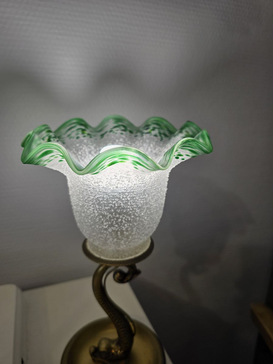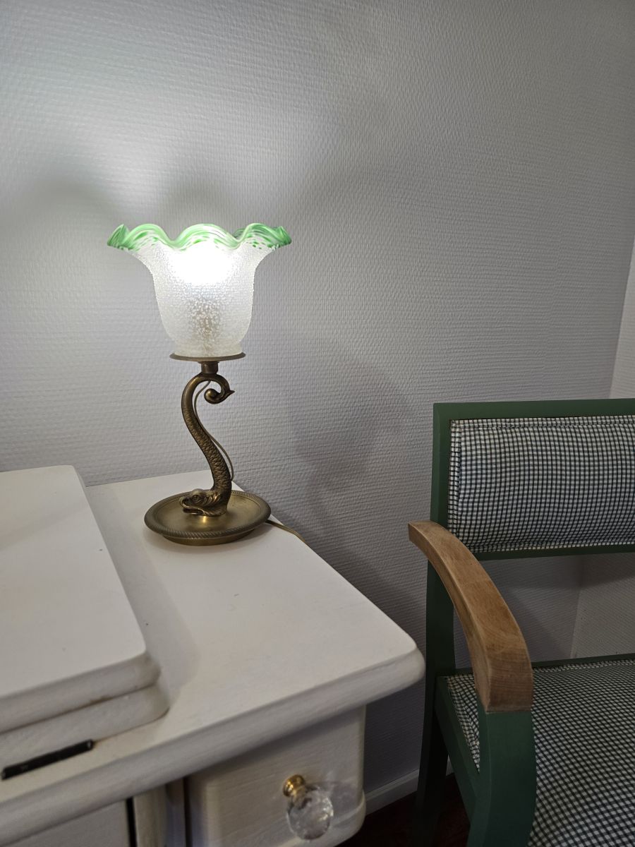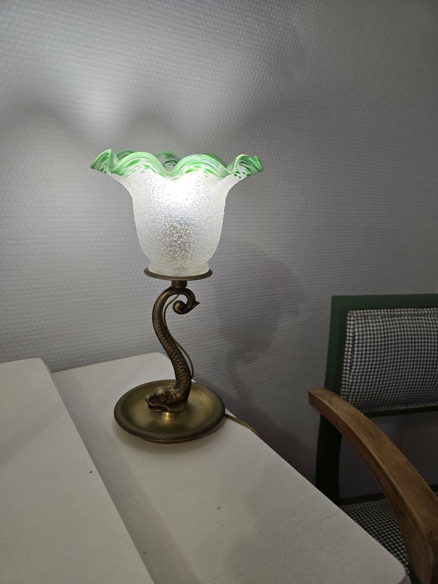 Petite lampe à poser composée d'un poisson en guise de pied en laiton et d'une tulipe très Art déco aux bords verts.