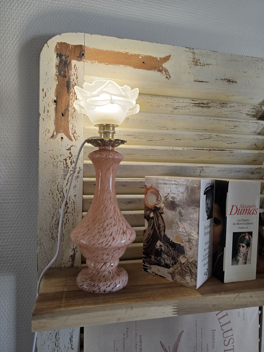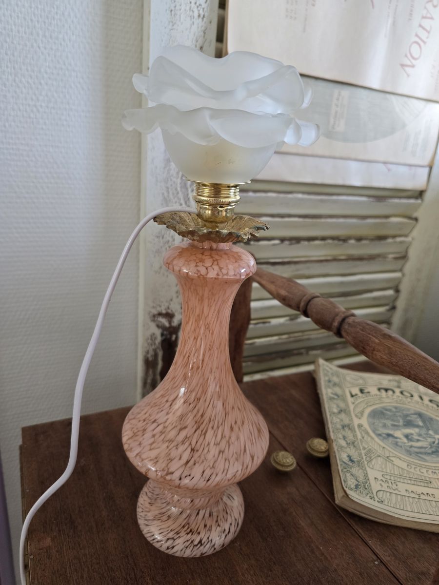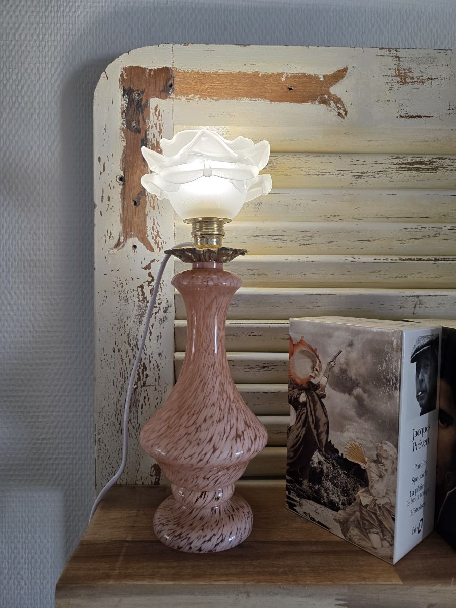 Lampe à poser pied en verre de Clichy rose et sa rose en pâte de verre.