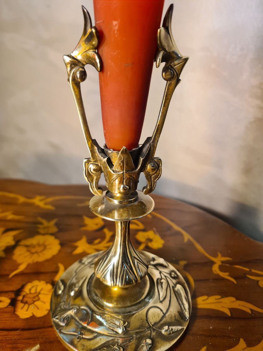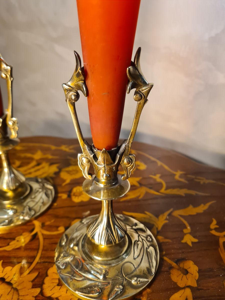 paire vase bronze et pate de verre art nouveau bouquetiere29x9 ,cornet soliflor 1900 a 1930