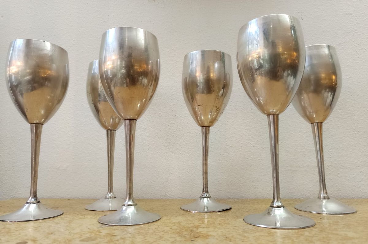 Lot de six verres sur pieds, ou coupes, en métal argenté vintage vers 1970. Belle brillance.