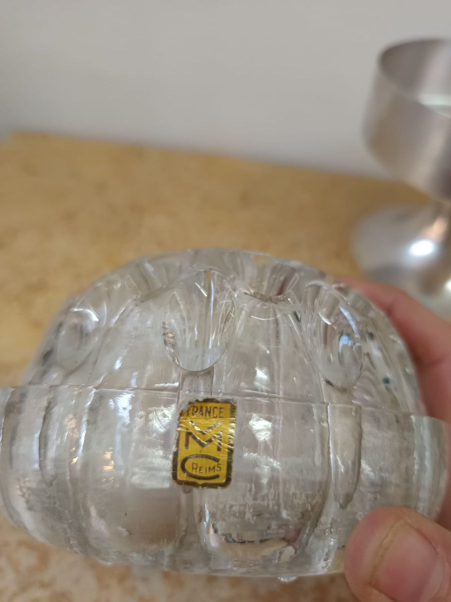 Pique fleurs en verre de Reims (étiquette d'origine) sur un support en métal brossé pied tulipe.