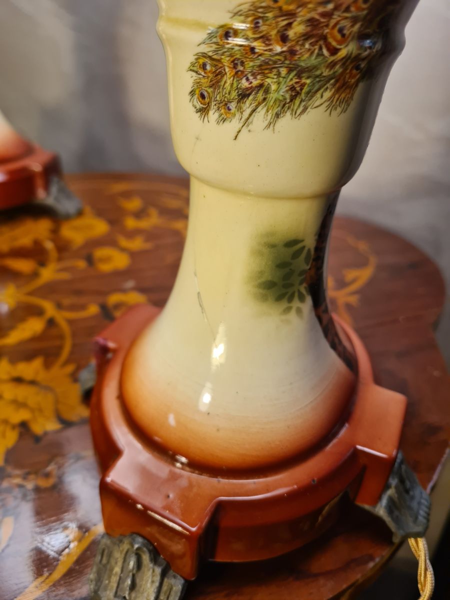 paire de lampes ceramique ,art nouveau 1900 a 30 traces d usure legere vue son age , tres beau decor paon typique de cette epoque,superbe tres classe , electricité refaite entierement douille laiton a tirette, 55x30
