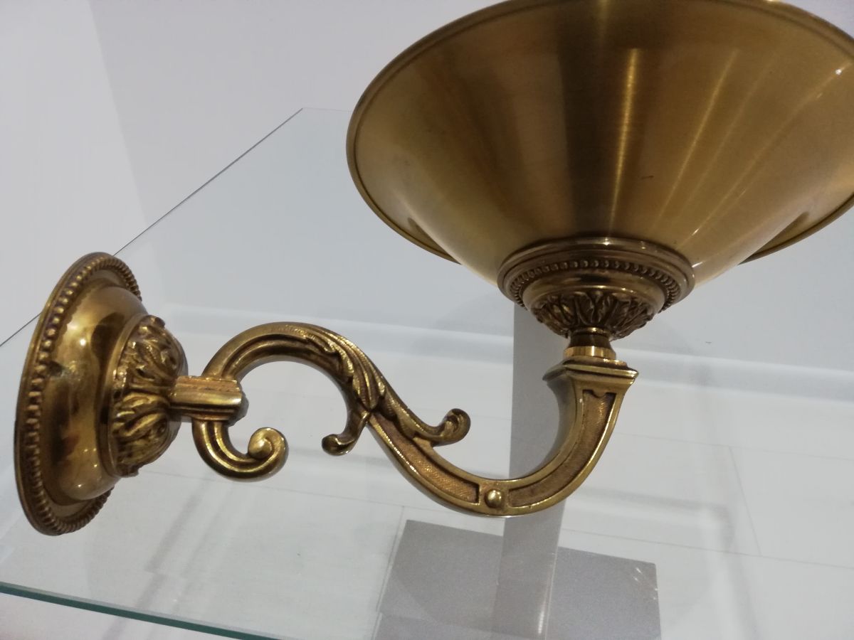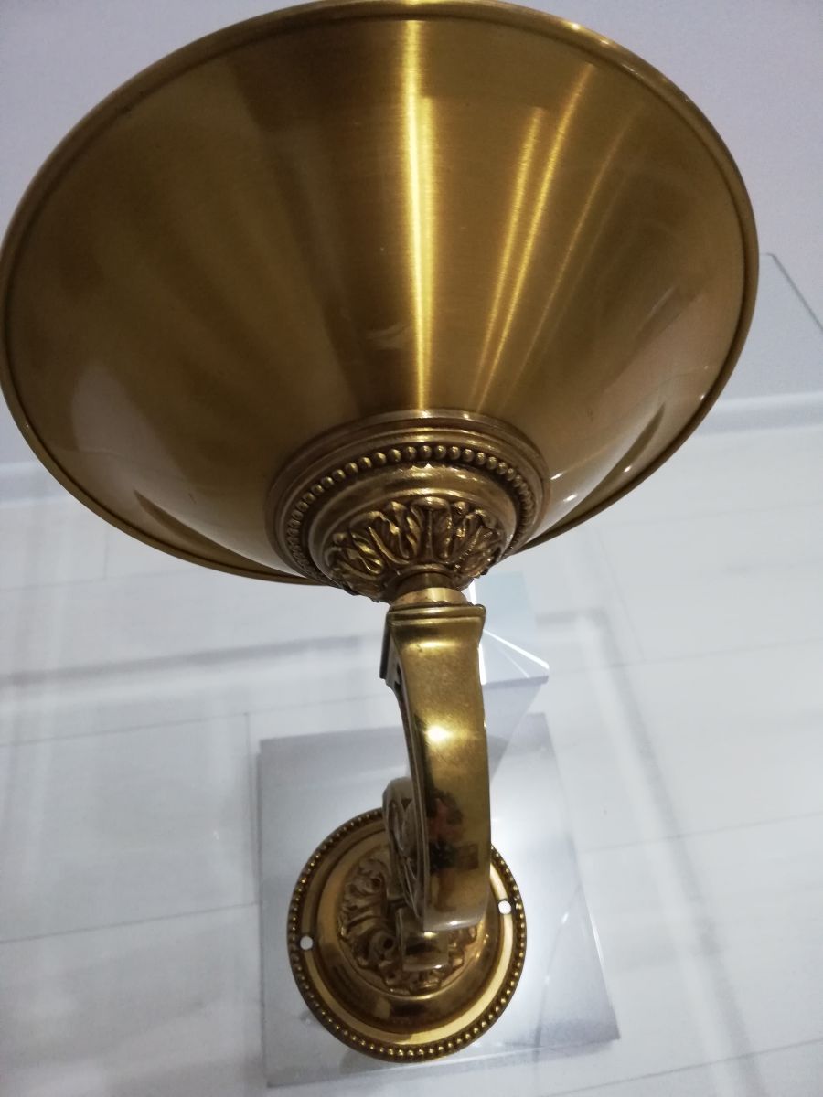 BELLE APPLIQUE HALOGENE EN BRONZE DORE STYLE LOUIS XVI, l'applique Lucien Gau, une merveille en bronze qui s'inspire du style Louis XVI. Alliant élégance intemporelle et sophistication, elle présente une vasque polie et mate gracieusement évasée, soutenue par un bras en double volute.Chaque détail de cette pièce, fabriquée en France, témoigne d'un savoir-faire artisanal inégalé.Inspirée de la magnificence de l'époque Louis XVI, l'applique Lucien Gau en bronze est plus qu'une simple source de lumière : c'est une pièce d'art qui élèvera instantanément le prestige de n'importe quelle pièce de votre maison. Une Célébration du Style Louis XVI :Chaque aspect de cette applique rappelle le raffinement et l'opulence du style Louis XVI. La vasque, méticuleusement polie et mate, évoque les designs emblématiques de cette période historique. La forme évasée de la vasque offre non seulement une esthétique plaisante, mais assure également une diffusion optimale de la lumière.Détails Sophistiqués et Artisanat :Le bras de l'applique, soigneusement sculpté en double volute, est un témoignage du niveau d'artisanat impliqué dans la création de cette pièce. La base, qui abrite la source lumineuse, est ornée d'une décoration raffinée qui reflète l'attention portée aux détails.Qualité et Durabilité :Fabriquée en France, cette applique témoigne d'un engagement envers la qualité et la durabilité.