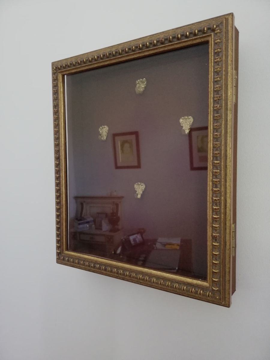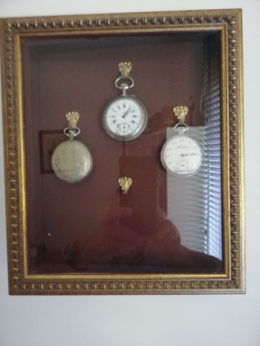 Vitrine murale pour exposer 4 montres à goussets. Dôme en verre avec crochet - Pour protéger les montres de poche de la poussière - Base en bois avec finition velour couleur sang et encadrement style ancien - H 27,5 cm - L 23,5 cm - Epaisseur 5 cm.